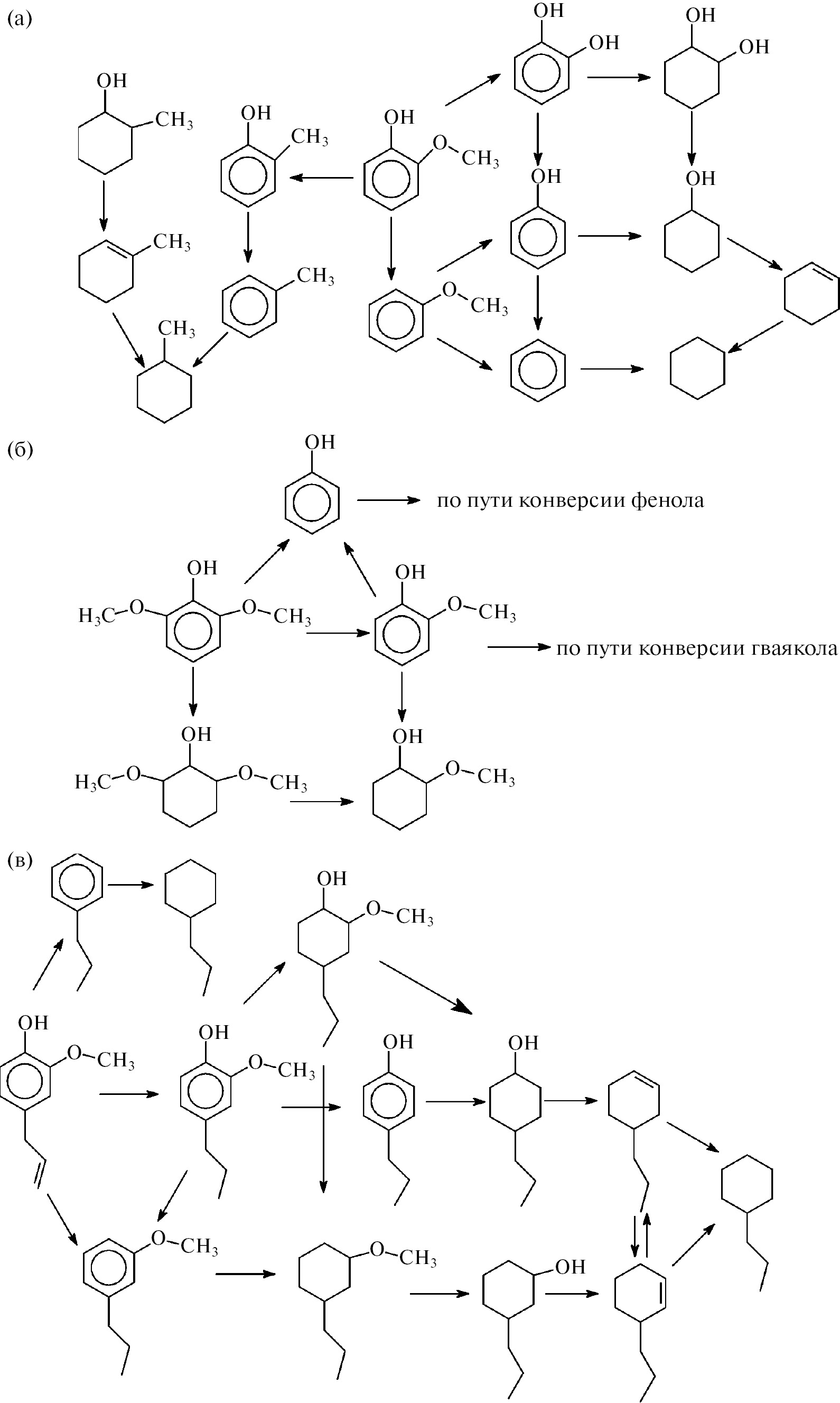 Схема 2. Пути превращения мономеров деполимеризации лигнина: гваякола (а), сирингола (б) и эвгенола (в)