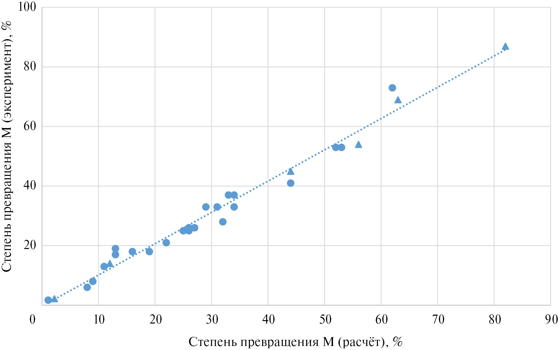 Рис. 1. Сравнение расчетных и экспериментальных значений степени превращения М в Т при температурах 220 (•) и 260°С (▲)