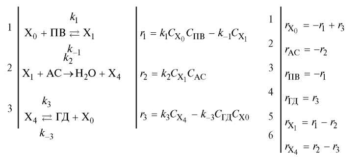 Сокращения и обозначения: АХ – аллилхлорид; ПВ – пероксид водорода; ЭПХ – эпихлоргидрин; ГД – глицидол; АС – аллиловый спирт; X0 – активный центр катализатора; X1 – интермедиат, продукт адсорбции H2O2 на X0; X2 – продукт адсорбции алкена на X0; X3 – интермедиат, представляет собой X0, на котором одновременно адсорбировались пероксид водорода и алкен; X4 – продукт адсорбции эпоксида на X0; S – стандартная ошибка; – скорректированный коэффициент детерминации; W – скорость образования продукта; k – наблюдаемая константа скорости; С – концентрация.