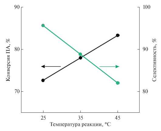 Температура существенно влияет на технологические показатели процесса (рис. 3). Ее повышение с 25 до 45°С приводит к увеличению конверсии ПА с 72.2 до 83.8%. Однако возрастание конверсии сопровождается снижением селективности реакции с 95.5 до 81.8%. Побочными продуктами являются 2-метил-2-пентеналь, ацетали и их полимеры.