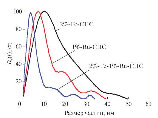 Рис. 1. Распределение частиц по размерам, полученное методом МУРР для образцов 2% Fe–СПС, 1% Ru–СПС и 2% Fe–1% Ru–СПС.