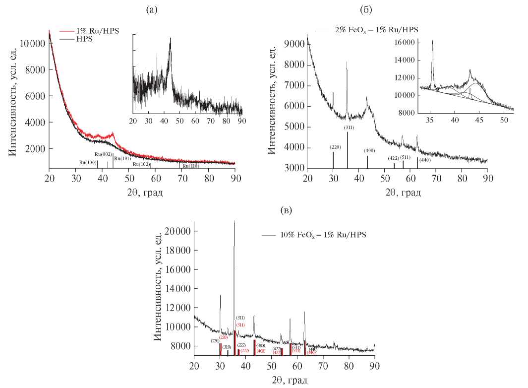 На дифрактограмме образца 2% Fe–1% Ru–СПС (рис. 2б) присутствуют рефлексы, которые характерны для структуры Fe3O4 [36–40]. Размер ОКР для частиц оксида железа(III) равен 31 нм, а параметр ячейки a – 8.38 Ǻ. Также на дифрактограмме имеются уширенные пики, которые можно отнести к структуре металлического рутения. Размер ОКР для частиц Ru составляет 2.8 нм.