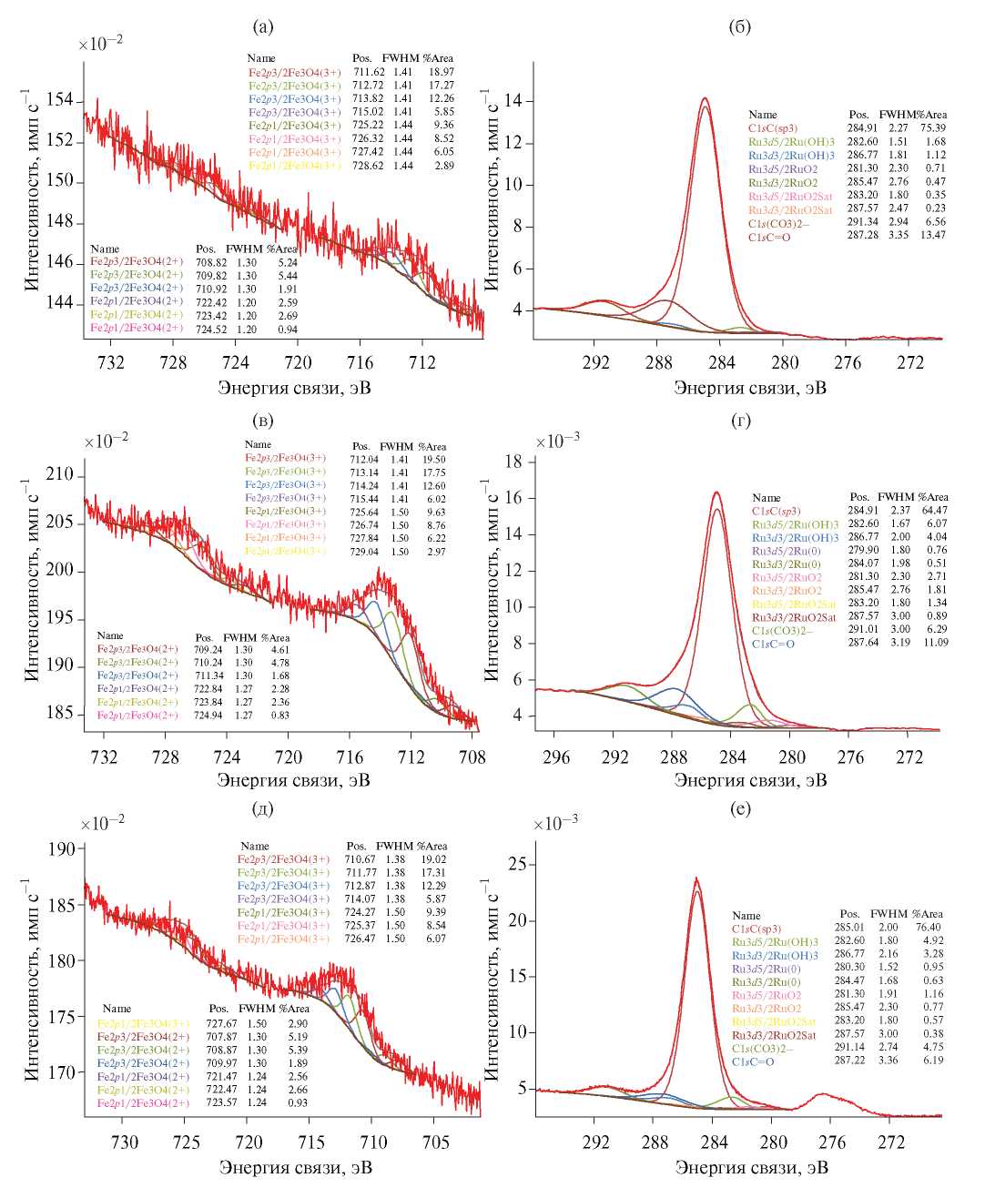 Рис. 3. Спектры высокого разрешения для подуровней Fe2p и Ru3d для образцов 2% Fe–СПС (a), 1% Ru–СПС (б), 2% Fe–1% Ru–СПС (в, г) и 2% Fe–1% Ru–СПС-отр (д, е).