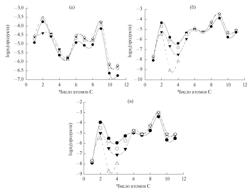 Для исследования превращений продуктов, происходящих в процессе синтеза Фишера–Тропша в периодическом режиме, были построены кривые образования продуктов в координатах logn(продукта)–число атомов С, учитывающие как ненасыщенные, так и кислородсодержащие соединения (рис. 6).