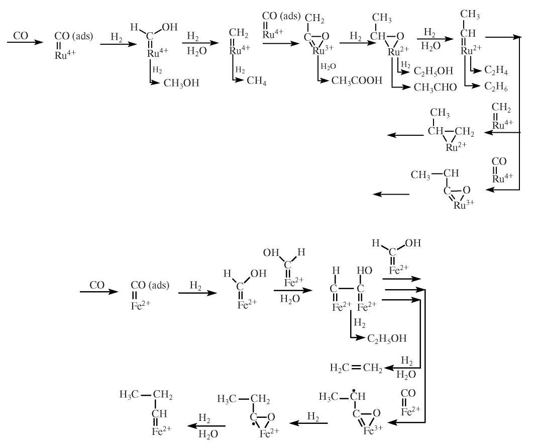 Известные механизмы СФТ основаны на способностях частиц активной фазы катализатора хемосорбировать монооксид углерода в ассоциативной или диссоциативной форме. В зависимости от структуры образованных мономерных звеньев и поверхностных реакций, происходящих на каталитически активных частицах, различают карбеновый механизм, внедрение СО, гидроксикарбеновый механизмы и алкилиденовый механизм [11]. В литературе эти схемы рассматриваются при использовании монометаллических катализаторов и в газофазном режиме.