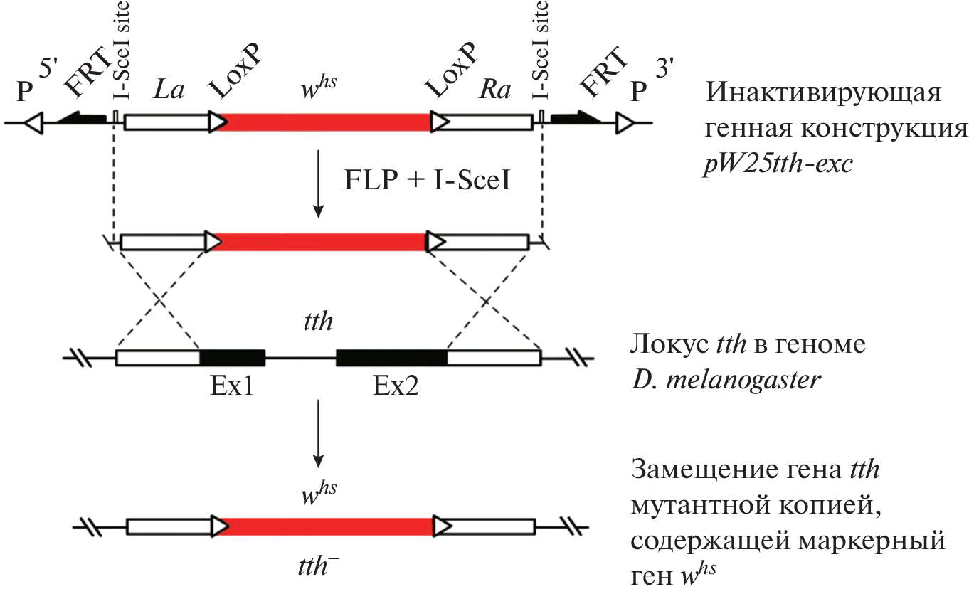Drosophila toothrin gene is related to the conserved d4 family of genes that encode specific transcription factors. In early works, we investigated the effect of tth gene overexpression and characterized the specific pattern of its expression in the nervous system, but mutations in the tth gene have not yet been found. Null mutants are essential for analyzing gene function and screening of partner genes. Here we report the generation of the first tth gene knockout in Drosophila using a homologous recombination technique.