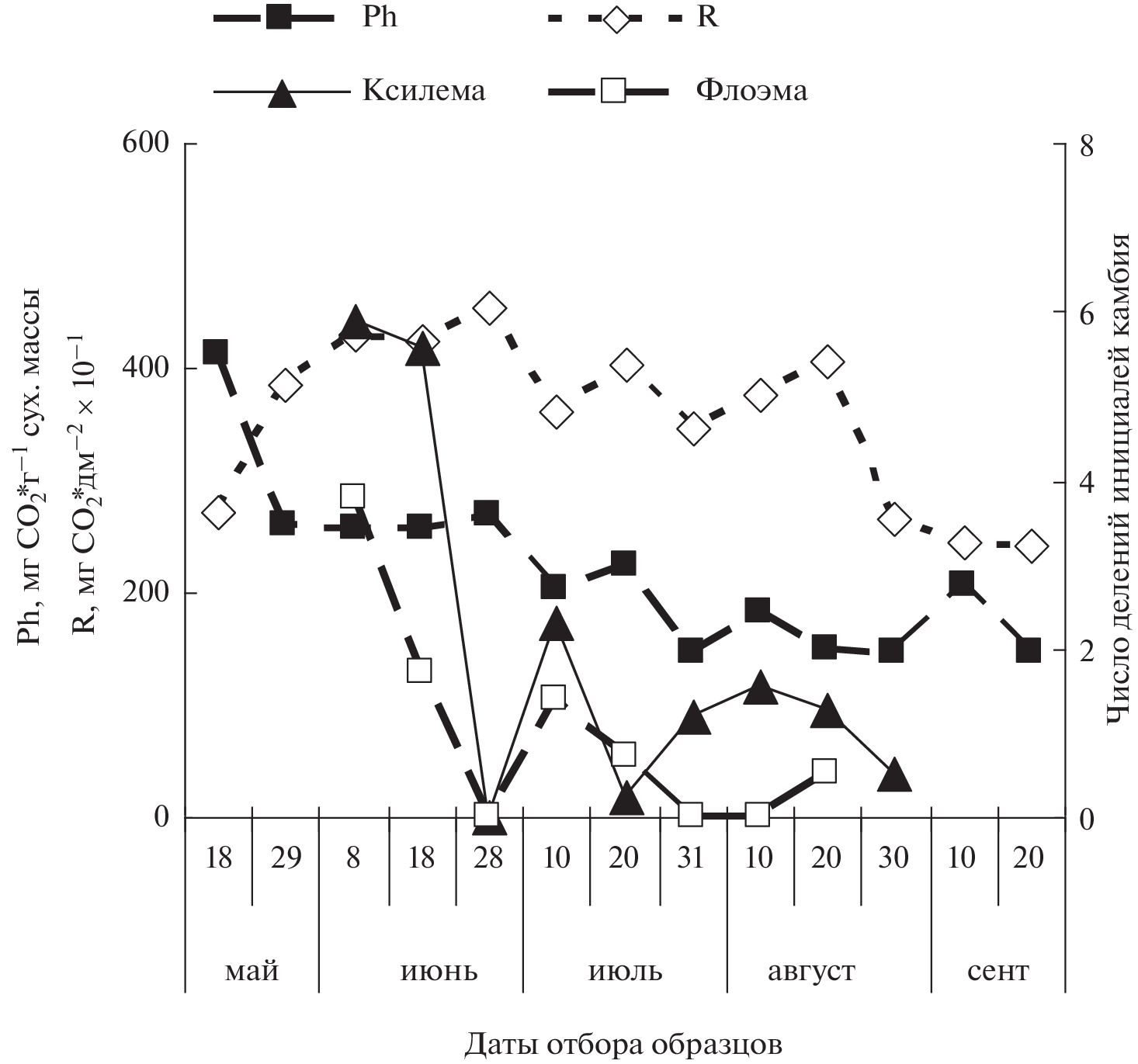 - Gordon J.C., Larson P.R. Seasonal Course of Photosynthesis, Respiration, and Distribution of 14C in Young Pinus resinosa Trees as Related to Wood Formation // Plant Physiol. 1968. V. 43. P. 1617–1624.
