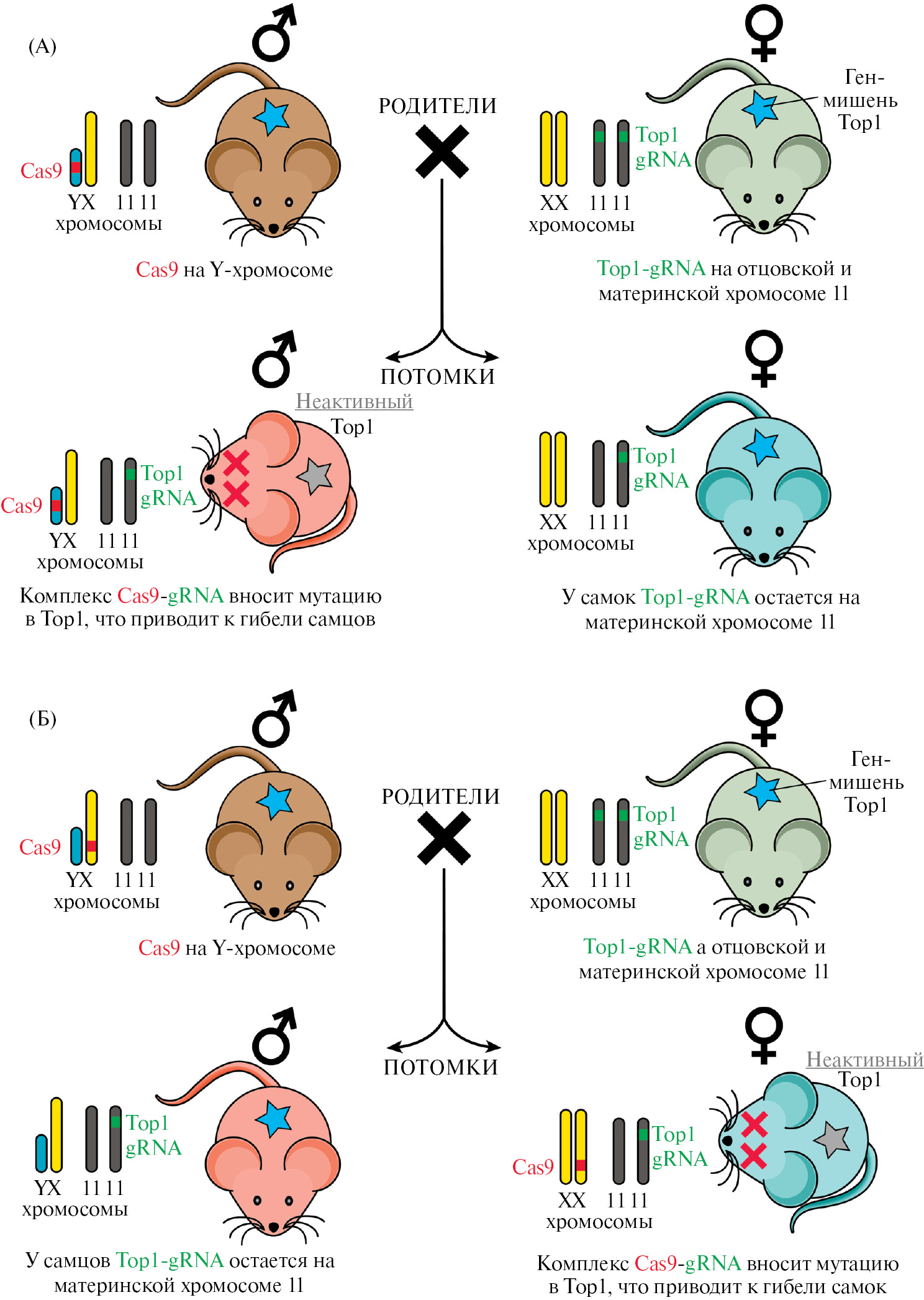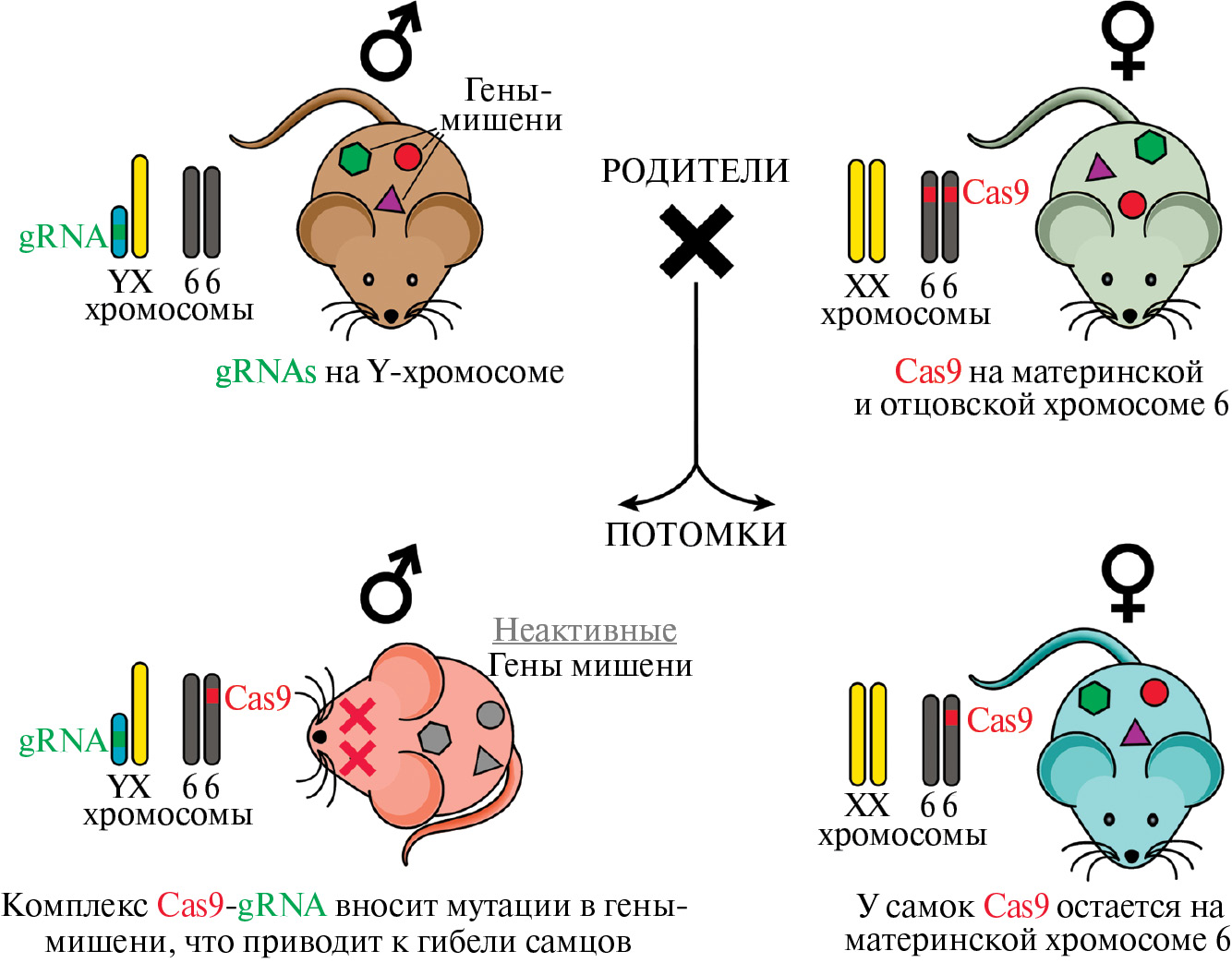 У некоторых беспозвоночных, а также позвоночных животных с наружным оплодотворением, имеющих промысловое значение (например, ракообразные, рыбы), пол потомства часто определяется температурным фактором или кислотностью окружающей среды, в которой происходит оплодотворение. Это легко позволяет получать особей нужного пола. Такой подход, однако, не может быть использован для получения только самцов или самок у млекопитающих, у которых пол определяется набором половых хромосом. У млекопитающих гетерогаметным полом является мужской и определяется наличием двух половых хромосом (XY), а женский пол, наоборот, гомогаметный (XX). Так как гаметы гаплоидны и несут только одну из половых хромосом то, следовательно, у самцов могут быть сперматозоиды двух типов, содержащие только X- или только Y-хромосому. При этом Y-хромосома, как правило, меньше X-хромосомы, что приводит к небольшим различиям в весе и размере между “X”- и “Y”-гаметами. Интересно, что такие различия у некоторых видов, например у крупного рогатого скота, достаточно существенны, что позволяет отсортировать сперму перед проведением искусственного осеменения. Однако используемая технология является очень дорогостоящей и не подходит для других видов сельскохозяйственных животных (Rath et al., 2018). В этом случае единственным альтернативным методом контроля соотношения полов у потомства может стать генетическая селекция. Генетическая селекция может быть достигнута, например, путем встраивания в одну из половых хромосом отца гена “самоубийства”. Если, к примеру, мы встроим такой ген в Y-хромосому, будут погибать все потомки мужского пола, а если в X — то женского. Такая модель потребует также наличия еще гена-“триггера”, приходящего от матери, который бы включал ген “самоубийства” в образующемся после оплодотворения зародыше. Вариации этого подхода с использованием CRISPR-Cas9 технологии направленного редактирования генома были уже использованы для манипуляции полом потомства у рыбки данио-рерио (Yin et al., 2015), комаров (Galizi et al., 2016), шелкопряда (Zang et al., 2018) и дрозофилы (Fasulo et al., 2020). У млекопитающих такой подход до недавнего времени осуществить не удавалось из-за определенных сложностей с экспрессией генов, расположенных на половых хромосомах. В настоящем обзоре мы рассмотрим три недавних исследования, отражающих эволюцию в подходе к генетической селекции потомства по полу у лабораторных мышей.