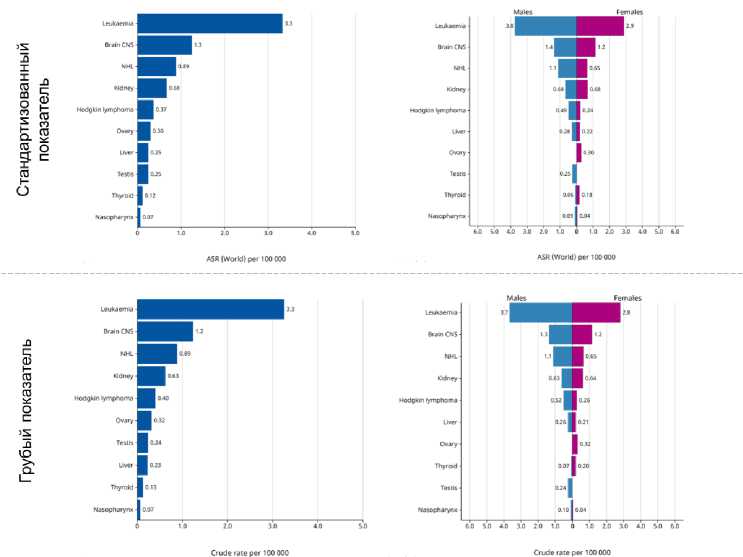 Fig. 2. Standardized and crude incidence rates of malignant neoplasms in children (0−14 years) in 2022, in general and by sex, per 100 000 population (IARC).