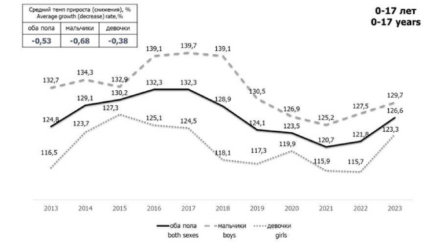 Fig. 5. Incidence of MN in the child population of the Russian Federation (0−17 years), by sex, for 2013−2023, per 1 000 000 child population (crude rates)