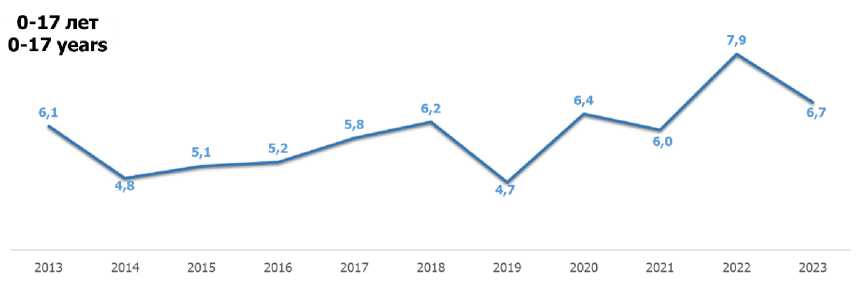 Одним из важнейших элементов комплексного анализа заболеваемости ЗНО среди детского населения является анализ и определение основных изменений демографических показателей. По данным Росстата, за период 2013−2023 гг. детское население (0−17 лет) Российской Федерации увеличилось на 9,4 % (с 27 374,4 тыс. человек в 2013 г. до 29 959,0 тыс. человек в 2023 г.), при этом динамика имеет куполообразный характер с пиком роста детского населения в 2020 г. (30 383,3 тыс. человек) и к 2023 г. тенденция динамики количества населения сменилась на снижение до 29 959,0 тыс. человек [27].