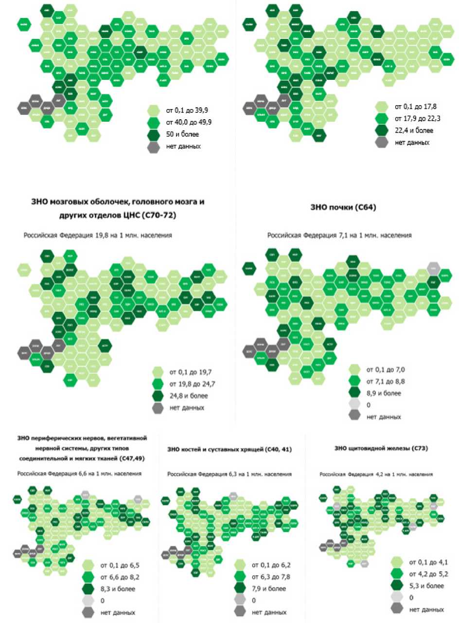 Несомненно, редкость возникновения в детской популяции таких заболеваний как ЗНО периферических нервов, вегетативной нервной системы, других типов соединительной и мягких тканей (С47,49), ЗНО костей и суставных хрящей (С40, 41) и ЗНО щитовидной железы (С73) существенно влияет на формирование показателей. Вместе с тем отметим регионы с наибольшими показателями: ЗНО периферических нервов, вегетативной нервной системы, других типов соединительной и мягких тканей (С47,49): Рязанская область (15,6 на 1 млн населения), Самарская область (13,8 на 1 млн населения) и Хабаровский край (13,6 на 1 млн населения); ЗНО костей и суставных хрящей (С40, 41): Севастополь (12,5 на 1 млн населения), Мурманская область (11,5 на 1 млн населения) и Республика Алтай (11,4 на 1 млн населения); ЗНО щитовидной железы (С73): Брянская область (19,8 на 1 млн населения), Санкт-Петербург (12,9 на 1 млн населения) и Омская область (11,3 на 1 млн населения), также в т. ч. по причине малого количества детского населения высокие показатели были отмечены в Чукотском автономном округе (21,6 на 1 млн населения) и Ненецком автономном округе (39,0 на 1 млн населения) — за весь исследуемый период на их территории было выявлено 3 и 5 случаев ЗНО щитовидной железы соответственно.
