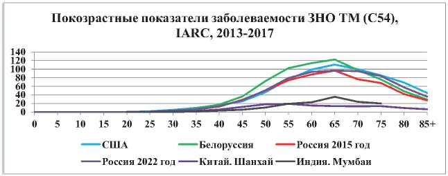 На рис. 2 представлено распределение повозрастных показателей заболеваемости женщин ЗНО ТМ (С54) в некоторых странах. До 30-летнего возраста регистрируется единичные случаи заболевания. Максимальные уровни выявлены среди 65-летних женщин. Низкие показатели заболеваемости женщин ЗНО ТМ (С54) фиксируются в Индии и Китае.