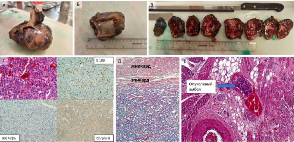 Fig. 5. Results of pathomorphological examination: A, Б, В — macroscopic examination of the removed tumor (В — type of tumor in serial sections); Г — microscopic examination of the tumor: staining with hematoxylin-eosin; magnification × 200. IHC study: diffuse expression of ChromA, S100 in sustentacular cells, low proliferative index Ki67; magnification × 200; Д — tumor limited to a thin capsule with a resected portion of the atrium; hematoxylin-eosin staining; magnification × 100; E — tumor embolus in the lumen of the venous vessel of the atrium wall; hematoxylin-eosin staining; magnification × 200