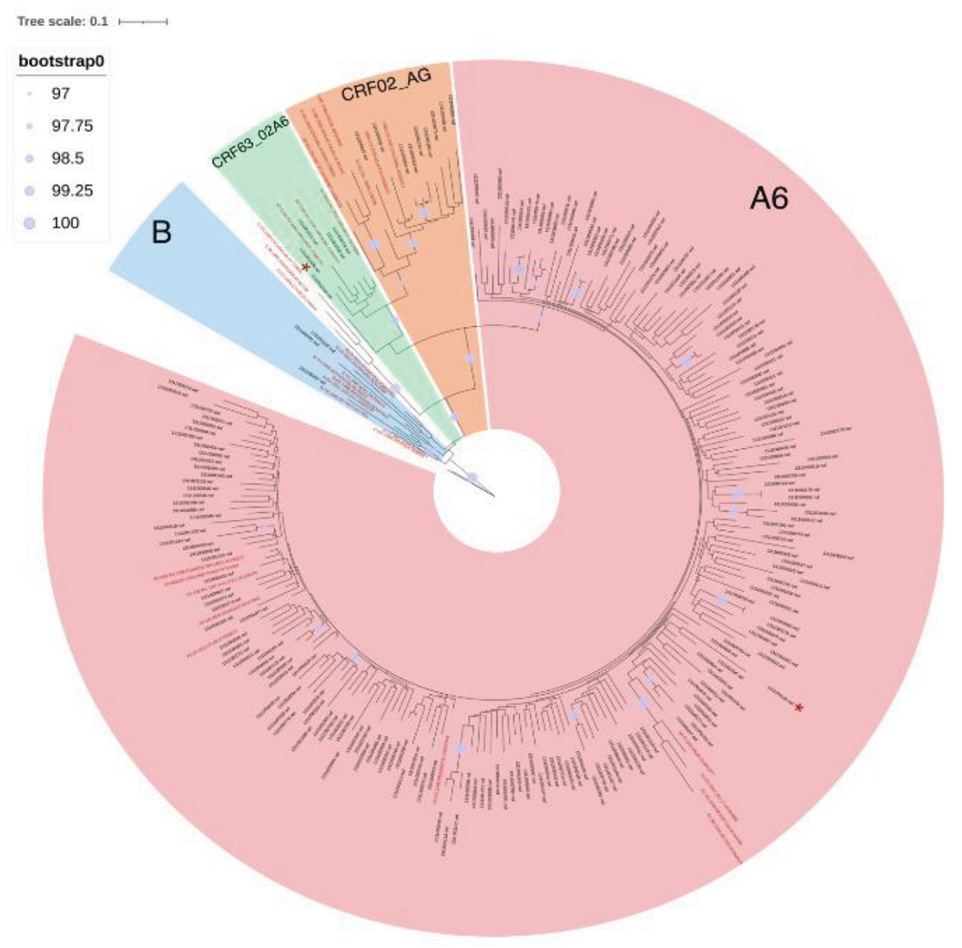 Materials and methods. Total 216 Nef sequences obtained from whole blood samples of patients and 77 sequences downloaded from the Los Alamos International Database were analyzed. Consensus sequences of Nef sub-subtype A6, subtype B, CRF02_AG, CRF63_02A6, CRF133_A6B, and the reference sequence NL4-3 were compared. Genetic diversity of Nef sub-subtype A6 (Nef-A6) in patients with different stages of the disease was assessed. The presence of dolutegravir-associated drug resistance mutations in the Nef protein in HIV-1 variants circulating in Russia was also investigated.