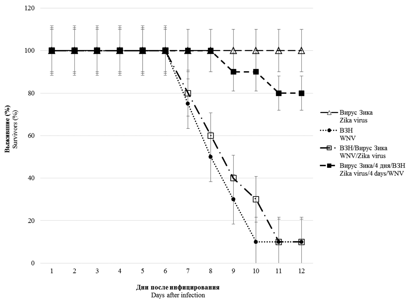 Результаты. При исследовании коинфицирования ВЗН и вирусом Зика in vitro показано, что совместное инфицирование приводит к интерференции, при этом степень конкурентного ингибирования репликации более выражена в отношении вируса Зика (в 1000 раз и более) при сравнении с моноинфекцией. При одновременном инфицировании мышей вирус Зика не влияет на развитие летальной инфекции, вызванной ВЗН. Однако предварительное (за 4 и 20 сут) инфицирование сублетальной дозой вируса Зика достоверно защищает животных от последующего введения 10 и 100 ЛД50 ВЗН. У предварительно инфицированных вирусом Зика коинфицированных животных зарегистрировано появление специфичных к ВЗН вируснейтрализующих антител в более высоком титре, чем у моноинфицированных ВЗН особей.