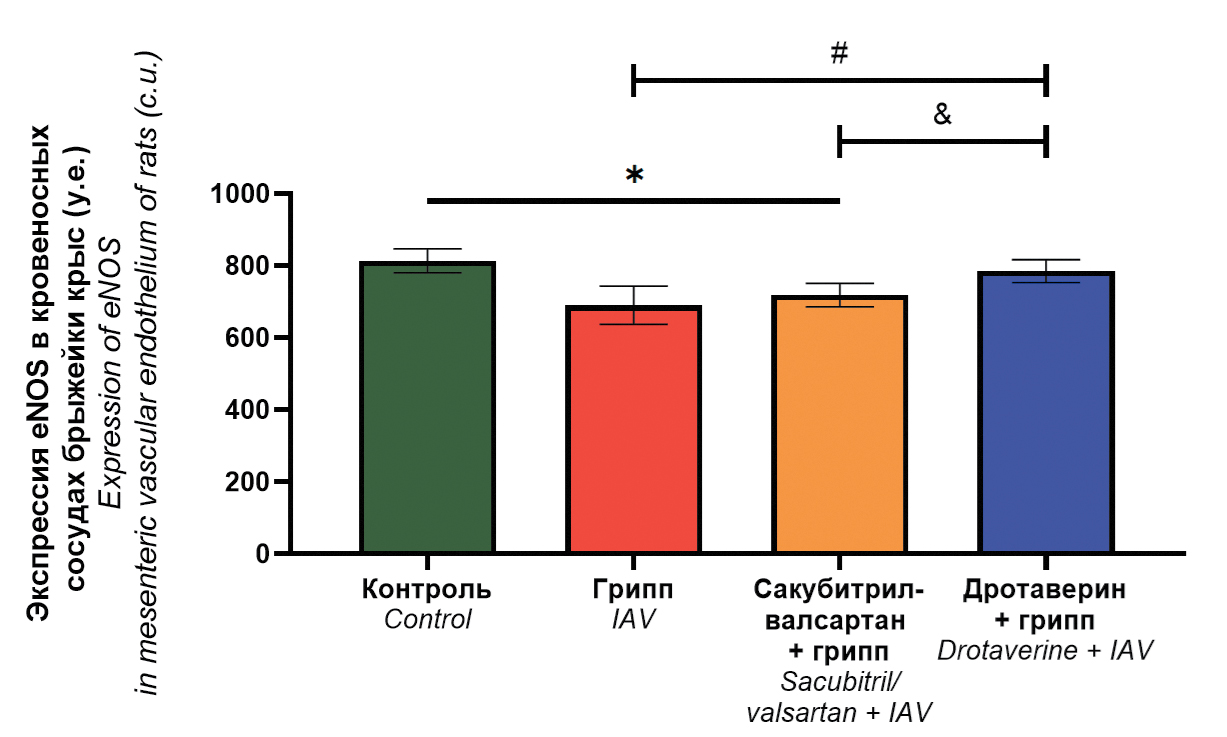 Материалы и методы. Исследование проведено на крысах стока Wistar, получавших внутрижелудочно валсартан-сакубитрил и дротаверин (в лечебно-профилактической схеме), с последующим интраназальным инфицированием ВГ A/СПб/48/16 (H1N1)pdm09. В качестве интактного контроля использовали крыс без введения препаратов; в качестве контроля заражения – животных, не получавших препараты, с последующим инфицированием ВГ. У крыс определяли титр ВГ в легких и брыжейке, оценивали степень поражения сосудистого эндотелия легких по трем параметрам: десквамация, изменение морфологии и дистрофические изменения; определяли уровень экспрессии эндотелиальной синтазы оксида азота (eNOS) в эндотелии кровеносных сосудов брыжейки, а также исследовали вазомоторную активность кровеносных сосудов брыжейки.