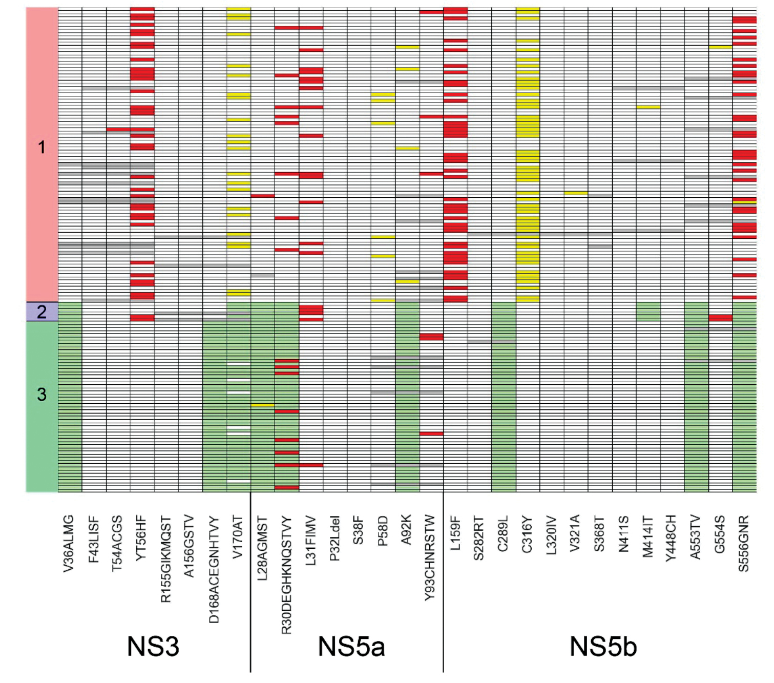 Результаты. Панель была апробирована на 153 образцах РНК ВГC, выделенных из крови (93/6/54 образца генотипов 1/2/3 соответственно). Анализ энтропии Шеннона показал, что в пределах гена E2 генетическая неоднородность значительно выше, чем в остальной части генома. Была определена частота встречаемости мутаций, ассоциированных с лекарственной резистентностью. В частности, для генотипа 1 была отмечена следующая частота встречаемости мутаций в NS3: Y56F – 37,6%, V170I – 23,7%; в NS5a: R30Q – 8,6%, P58L/S/T – 6,5%, A92T – 4,3%; в NS5b: L159F – 45,2%, S556G/N – 33,3%.