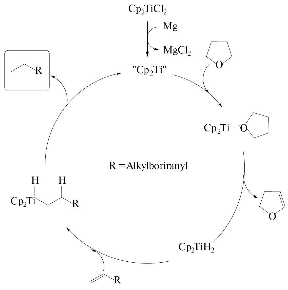 Комплексы титана показали себя также эффективными катализаторами в синтезе органических соединений бора, которые являются перспективными мономерами для создания новых материалов [15] и лекарственных препаратов [16−18]. Так, например, для построения связи В−С были разработаны титан-катализируемые методы гидроборирования [4, 19, 20] и дегидроборилирования алкенов/алкинов [21], в том числе и нами [22].