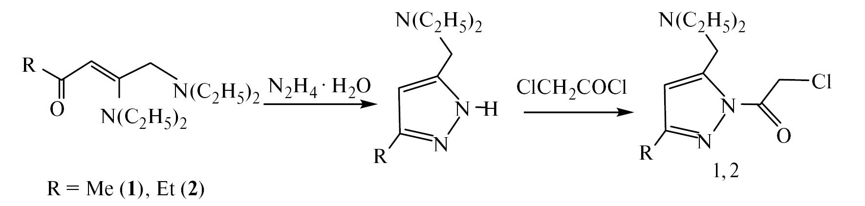 Цель нашей работы заключалась в получении производных пиразола, содержащих в молекуле гетероциклический фрагмент тиазола. В связи с этим использовали один из распространенных методов получения 1,3-тиазолов [17, 18]. В первую очередь нами были синтезированы 3-алкил-5-(диэтиламиномeтил)пиразолы с хлорметилкарбонильным заместителем (1, 2) в положении 1 соответственно (схема 1) [19–21].