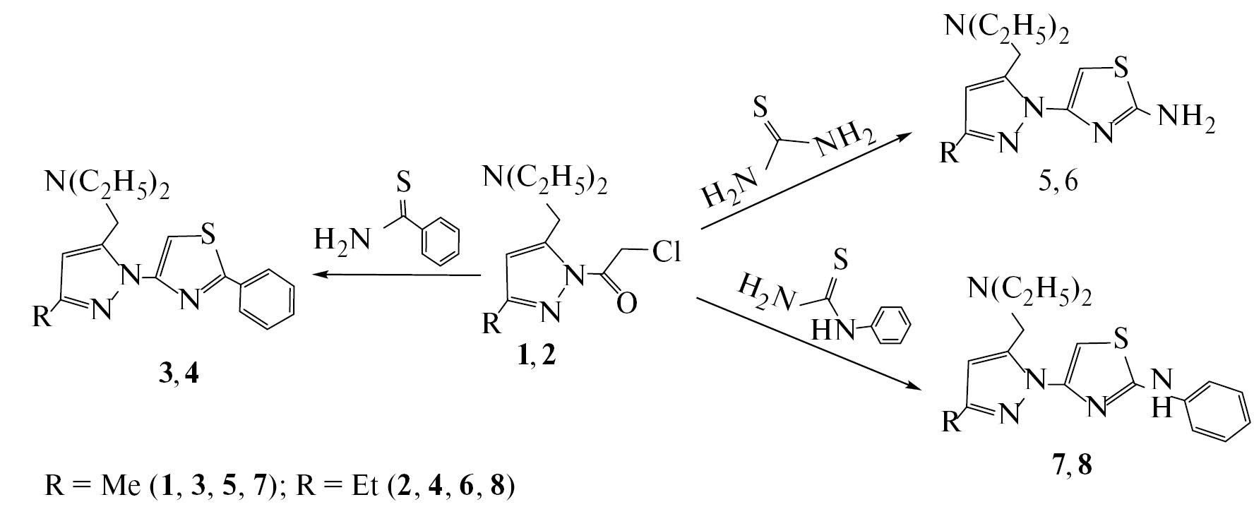 Синтезированные 3-алкил-5-(диэтиламинометил)-1-(2-хлорметилкарбонил)пиразолы 1, 2 оказались удобными синтонами для получения 1,3-тиазольного цикла. Установлено, что атом хлора и карбонильная группа в молекуле пиразола 1, 2, находящиеся в хлорметилкарбонильной цепочке, обладают высокой подвижностью. Реакция протекает при взаимодействии пиразолов 1, 2 с тиобензамидом, тиокарбамидом и фенилтиокарбамидом в присутствии эквимольного количества триэтиламина в среде этилового спирта и приводит к образованию соответствующих новых производных 1-(1,3-тиазол)пиразола 3–8 с выходами 69–72% (схема 2).