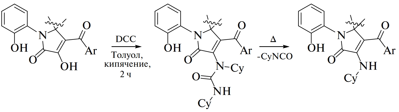 Установлено, что подход, предложенный ранее [17], имеет ограничения для синтеза некоторых 5-спирозамещенных 3-амино-1,5-дигидро-2Н-пиррол-2-онов, а реакции термолиза протекают неселективно в случае использования исходных продуктов типа метил 1-(2-гидроксифенил)-4,9-дибензоил-7-(4-метоксифенил)-2,6-диоксо-3-(1,3-дициклогексилуреидо)-1,7-диазоспиро[4.4]нона-3,8-диен-8-карбоксилата (9а) и 1-(6-(2-гидроксифенил)-2-имино-4,7-диоксо-1,3-дифенил-9-(4-хлорбензоил)-1,3,6-триазаспиро[4.4]нон-8-ен-8-ил)-1,3-дициклогексилмочевины (9b), в структуре которых есть замещенные пиррольный (продукт 9a) и имидазольный (продукт 9b) циклы, по-видимому, термически неустойчивые в исследованных условиях.