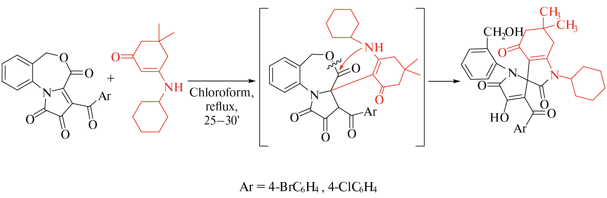 При взаимодействии 3-ароилпирроло[1,2-а][4, 1]бензоксазепин-1,2,4-трионов 1a,b с 3-циклогексиламино-5,5-диметилциклогекс-2-ен-1-оном происходит образование 3′-(4-ароил)-4′-гидрокси-1′-(2-(гидроксиметил)фенил)-6,6-диметил-1-циклогексил-6,7-дигидроспиро[индол-3,2′-пиррол]-2,4,5′(1H,1′H,5H)-трионов 2a,b (схема). Структура соединений 2 подтверждена методом рентгеноструктурного анализа (РСА) на примере соединения 2b (рисунок).