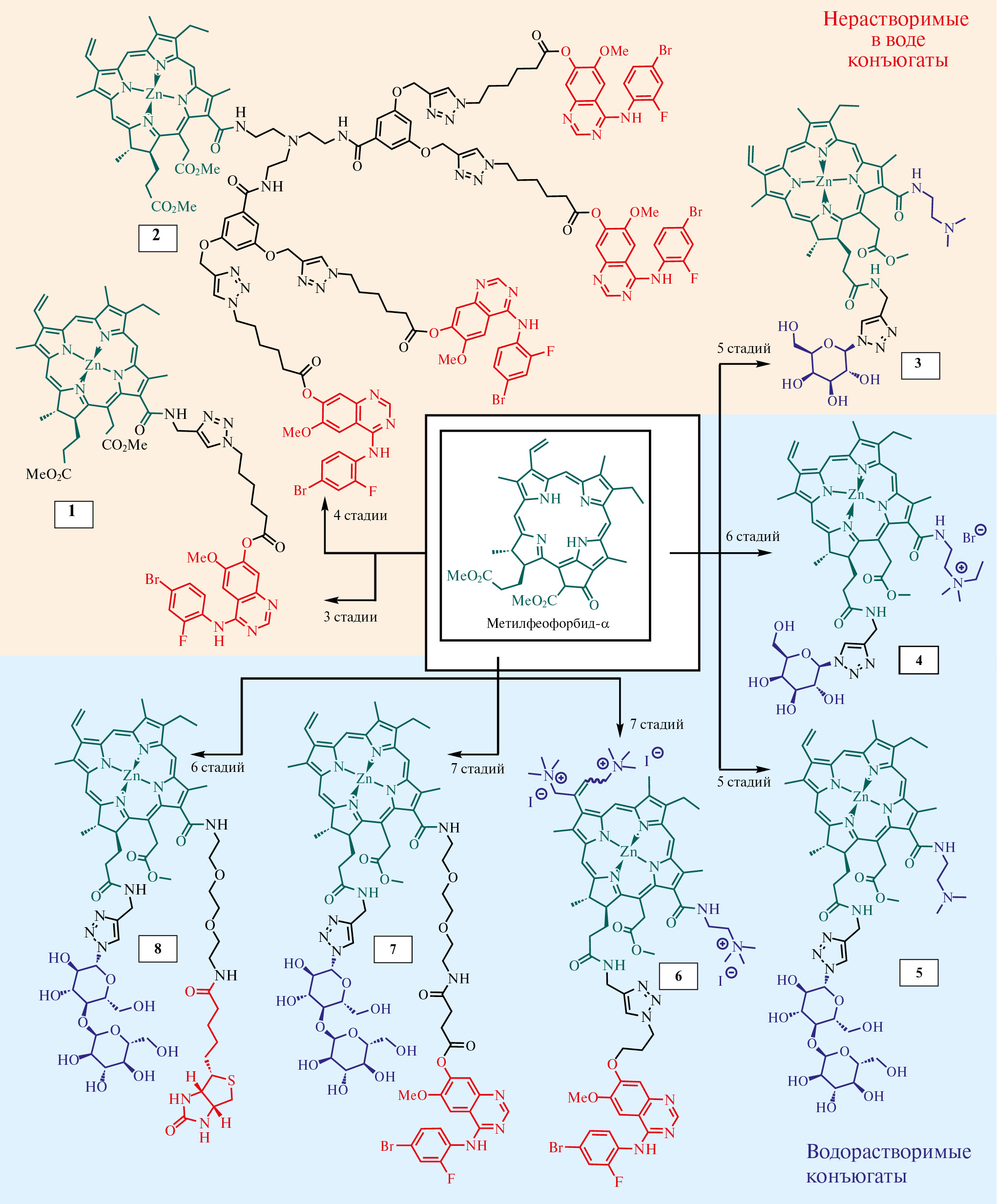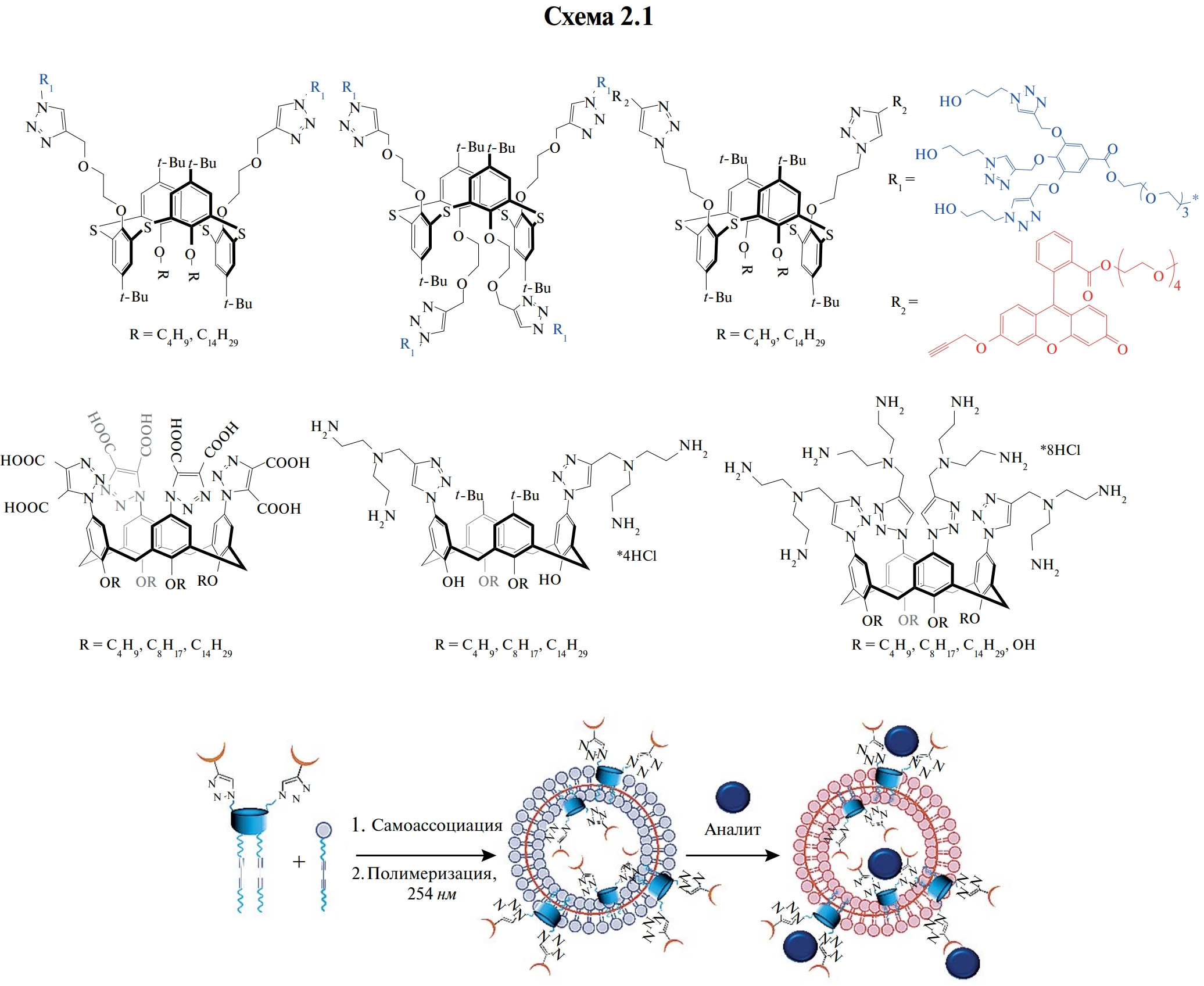 Научное направление по синтезу амфифильных соединений на основе производных (тиа)каликс[4]аренов активно развивается на кафедре органической и медицинской химии под руководством члена-корреспондента РАН И.С. Антипина и доцента, доктор химических наук В.А. Бурилова. Особое внимание к амфифильным молекулам связано с их способностью формировать в водных растворах высокоупорядоченные молекулярные ансамбли, обладающие способностью к молекулярному распознаванию и к многоцентровым взаимодействиям. Для построения подобных систем активно используется модульный подход клик-химии (реакция медь-катализируемого циклоприсоединения азидов и алкинов, CuAAC). Для построения амфифильных соединений используются производные тиакаликс[4]арена в стереоизомерной форме 1,3-альтернат, в которые вводятся различные функциональные группы, включая дендроны галловой кислоты [52], способные стабилизировать частицы палладия в виде нанодендритов, и фрагменты флуоресцеина [53, 54] (схема 2.1).