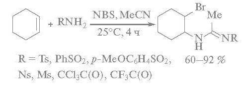 Алкены и сульфонамиды в присутствии N-бромсукцинимида (NBS) в качестве окислителя в среде нитрилов способны давать амидиновые продукты с хорошими выходами, что свидетельствует о вовлечении молекул растворителя в реакцию (схема 1) [1].