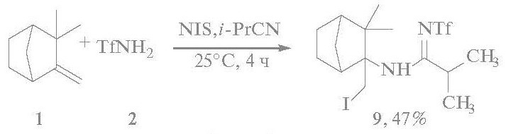 Реакция камфена (1) с трифламидом (2) не сопровождается перегруппировкой камфено-вого каркаса и приводит к образованию соответ-ствующего амидина с сохранением структуры исходного камфена. Строение соединения 9 было доказано данными ИК и ЯМР спектроскопии. В ИК спектре присутствуют полоса погло-щения аминогруппы при 3361 см–1, а также 2 полосы поглощения трифлильной группы при 1215, 1189 см–1. Спектр ЯМР 1H содержит сигнал NH-группы при 6.35 м.д. в виде уширеного синглета, 2 дублета при 4.72 и 3.56 м.д. со значением КССВ 10.9 Гц соответствуют CH2I группе. В спектре ЯМР 13С присутствует квартет группы CF3 при 116.79 м.д., которому соответствует сигнал в спектре ЯМР 19F при –80.68 м.д., также присутствует сигнал атома углерода C=N группы при 176.56 м.д. Состав продукта подтвержден данными масс-спектрометрии высокого разрешения (HRMS), которые показали наличие молекулярного иона [M + H]+ с массой 481.06338, соответствующей брутто-формуле C15H24F3IN2O2S.
