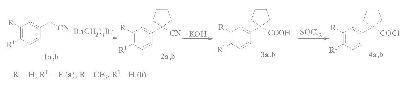 В качестве исходных продуктов в синтезе намеченных структур нами использованы 2-(4-фторфенил)- (1a) и 2-(3-(трифторметил)фенил)ацетонитрилы 1b. В литературе описаны методы синтеза нитрилов 1-(4-фторфенил)циклопентан- (2a) и 1-(3-(трифторметил)фенил)циклопентанкарбоновых кислот (2b) реакцией перечисленных ацетонитрилов с дибромбутаном с применением гидрида натрия в минеральном масле и последующей очисткой на хроматографической колонке [9]. Нами нитрилы 2а, b получены с выходами 67–70% при проведении конденсации ацетонитрилов 1a, b с 1,4-дибромбутаном в среде ДМФA в присутствии едкого натра и очищены перегонкой.