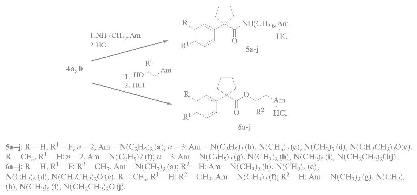 Целевые диаминоалкилзамещенные 1-(4-фторфенил)- и 1-(3-(трифторметил)фенил)циклопентанкарбоксамиды 5a–j получены реакцией хлорангидридов 4a, b с различными N,N-диметил(диэтил)алкил- и гетерил(пиперидин, морфолин)алкиламинами в бензольном растворе в присутствии триэтиламина. Реакцией тех же хлорангидридов 4a, b с разнообразными N,N-диалкиламиноалкилспиртами и гетерил(пирролидин, пиперидин, морфолин)этанолами в тех же условиях получены аминоэфиры 1-(4-(фторфенил)- и 1-(3-(трифторметил)фенил)циклопентанкарбоновых кислот 6а–j (схема 2). Все синтезированные аминоамиды и аминоэфиры – маслообразные соединения, которые охарактеризованы в виде гидрохлоридов, полученных действием на эфирные растворы оснований эфирным раствором хлористого водорода. В ИК спектрах аминоамидов наблюдаются полосы поглощения в области 3266–3330 и 1640–1669 см–1, характерные для NН и С=О групп соответственно, а у аминоэфиров – в области 1720–1735 см–1, что соответствует сложноэфирной С=О группе.