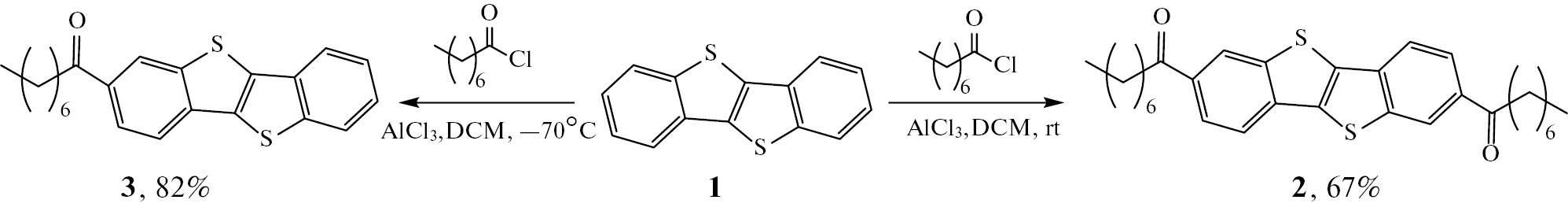 Одним из наиболее часто применяемых производных ВТВТ в органической электронике является дизамещенный 2,7-диоктибензо[b]бензо[4, 5]тиено[2,3-d]тиофен (C8-BTBT-C8) [25–27]. Описаны варианты синтеза подобных соединений, основанные на последовательных реакциях ацилирования по Фриделю—Крафтсу и дальнейшем восстановлении кетогруппы [28, 29]. Однако синтез таких соединений ограничен невысокими выходами в реакции восстановления, и поэтому поиск эффективной стратегии получения алкилзамещенных производных BTBT является актуальной исследовательской задачей. В данной работе исследованы подходы к синтезу моно- и диоктилзамещенных производных BTBT.