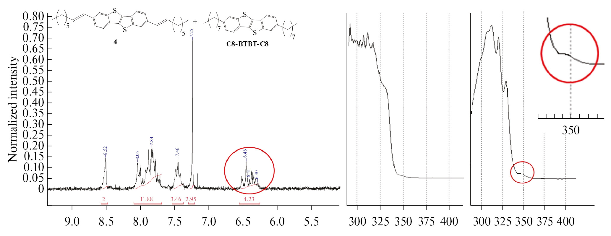Рис. 2. Фрагмент спектра 1Н ЯМР смеси C8-BTBT-С8 и промежуточного продукта 4 с характерными сигналами (а); фрагмент спектра поглощения побочного соединения 4 с двойной связью (слева) и спектр поглощения целевого С8-BTBT-C8 (справа) (b). По оси абсцисс – длина волны, нм; по оси ординат – интенсивность поглощения, отн. ед.