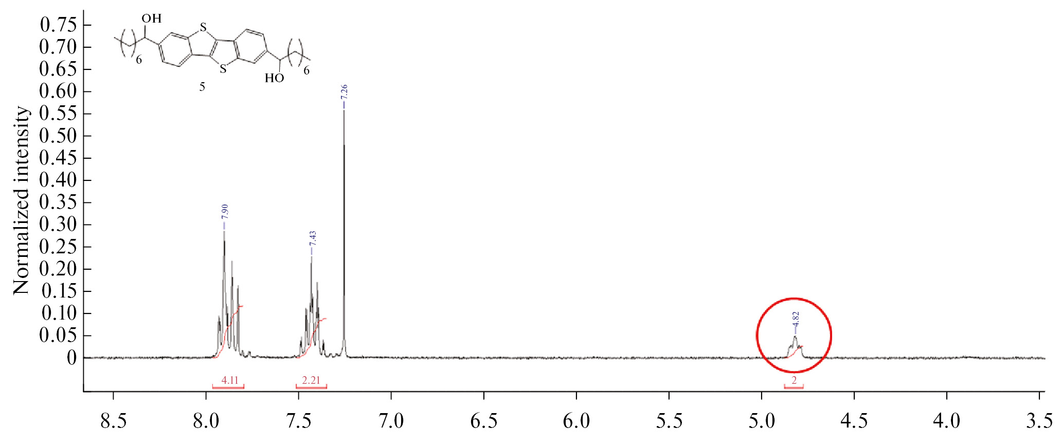 Второй способ – восстановление с использованием смеси LiAlH4 и AlCl3 в диэтиловом эфире – не дал положительных результатов. При использовании смеси мелкодисперсного LiAlH4 и AlCl3 в максимально сухом эфире (содержание воды ~18 ppm) восстановление проходило до образования побочного продукта 1,1'-(бензо[b]бензо[4, 5]тиено[2,3-d]тиофен-2,7-диил)бис(октан-1-ола) (5), что подтверждается данными 1Н ЯМР— спектроскопии (рис. 3). Следует обратить внимание, что после выделения 1,1'-(бензо[b]бензо[4, 5]тиено[2,3-d]тиофен-2,7-диил)бис(октан-1-ола) (5) и последующего восстановления в тех же условиях образовывался целевой C8-BTBT-С8, однако оптимизация условий с увеличением количества LiAlH4 и AlCl3, вводимых на первой стадии, не изменило основного продукта реакции, а получить целевой C8-BTBT-С8 не удалось.