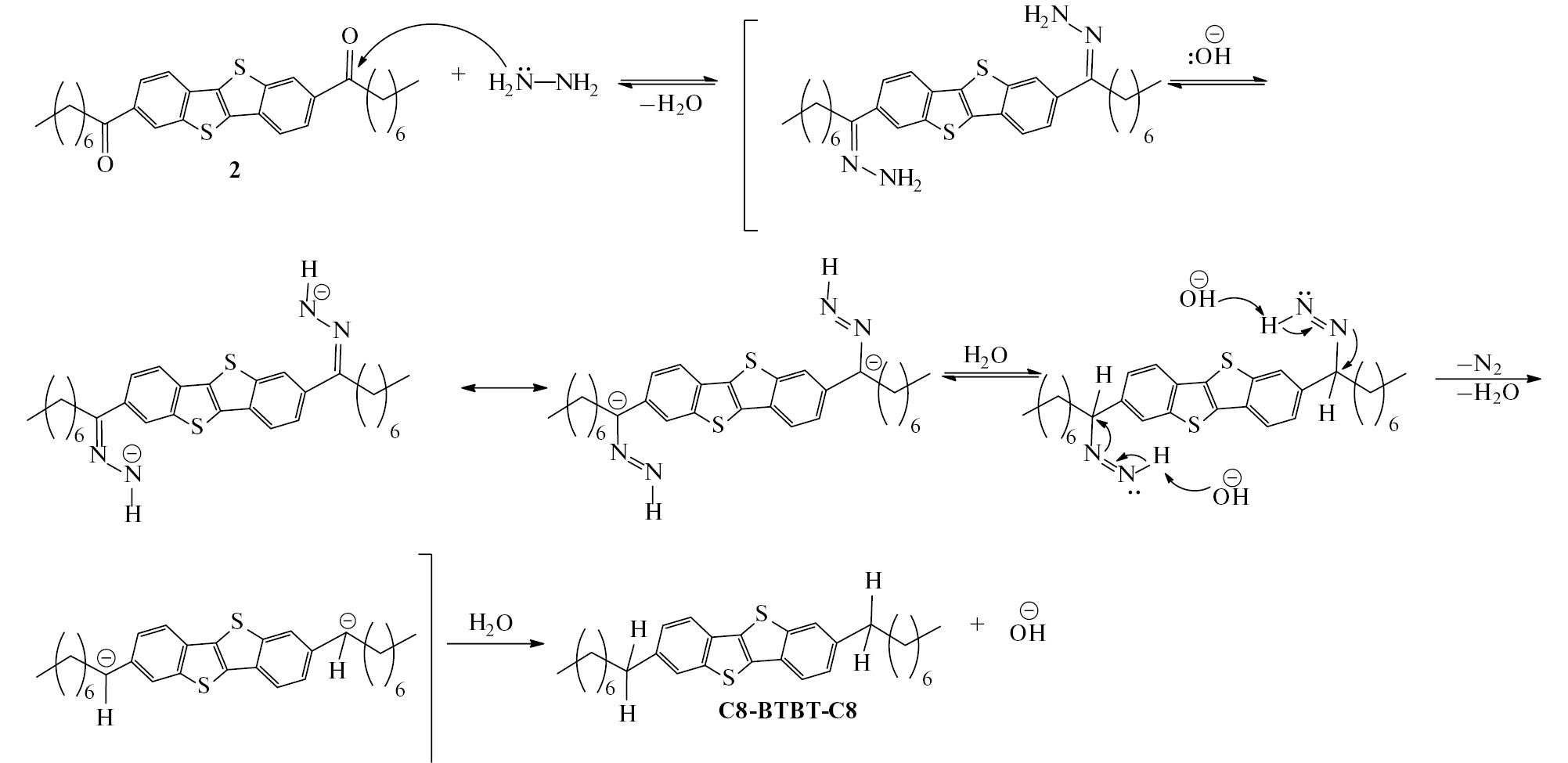 Третий способ – восстановление с использованием N2H4 × H2O – оказался наиболее эффективным. Реакцию восстановления проводили при десятикратном избытке N2H4 × H2O к смеси исходного соединения 2 и щелочи в этиленгликоле, после чего реакционную смесь перемешивали при кипении в течение 4 ч. Контроль за полнотой прохождения реакции осуществляли с помощью ТСХ. В результате очистки методом флэш—хроматографии в толуоле был получен целевой C8-BTBT-С8 с выходом 89%. Предполагаемый механизм реакции показан на схеме 5.