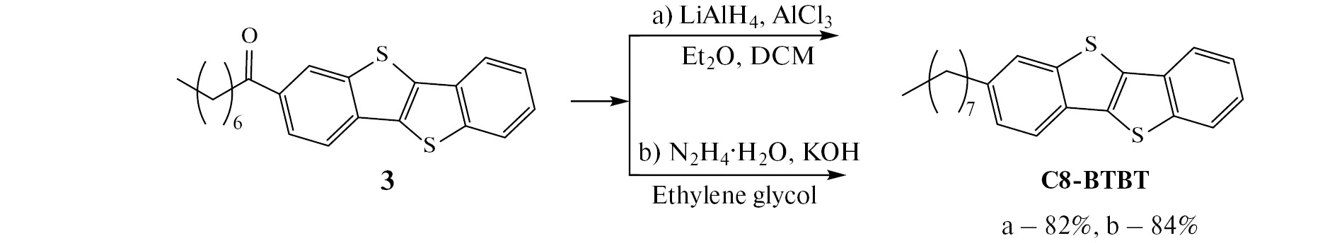 Восстановление монозамещенного соединения 3 проводили с использованием системы LiAlH4/AlCl3. Для этого к суспензии алюмогидрида лития и AlCl3 в диэтиловом эфире прикапывали раствор исходного соединения 3 в дихлорметане. Смесь перемешивали под аргоном при комнатной температуре в течение 15 ч. Контроль за ходом реакции осуществляли методом ТСХ. Содержание воды в используемых растворителях составляло: в дихлорметане ~ 13 ppm, в диэтиловом эфире ~18 ppm. В результате был получен целевой C8-BTBT с выходом 82 % (схема 6).