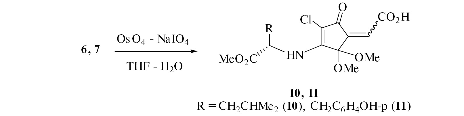 Метил-N-[(4Z)-4-карбокcиметилен-5,5-диметокси-3-оксо-2-хлор-1-циклопент-1-ен-1-ил]-L-лейцинат (10). К перемешиваемому раствору 82 мг (0.19 ммоль) соединения 6 в 10 мл смеси ТГФ–Н2О (3 : 1) прибавляли 3 мг ОsО4 и по истечении 15 мин наблюдали почернение реакционной массы, затем прибавляли по каплям раствор 0.2 г (0.95 ммоль) NaIO4 в 5 мл Н2О. Смесь перемешивали при комнатной температуре в течение 3 ч, выпавший осадок NаIО3 отфильтровывали, ТГФ упаривали, остаток экстрагировали СН2Сl2 (3 × 10 мл). Объединенные органические экстракты промывали насыщенным водным раствором NаСl, сушили МgSО4, растворитель упаривали. Остаток очищали кристаллизацией из диэтилового эфира. Выход 46 мг (60%) в виде смеси изомеров в соотношении 2 : 1 (по интегральной интенсивности протонов CHN-фрагмента). Бесцветные кристаллы, т.пл. 179–181˚С. [α]D20 +54˚ (с 0.5, CHCl3). ИК спектр, ν, см–1: 3237, 2926, 1751, 1715, 1595, 1547, 1537, 1462, 1456, 1377, 1271, 1151, 1105, 964, 901, 721, 633. Масс-спектр (EI), m/z (%): 376 (377, 378) [M + H]+ (100). Найдено, %: C 51.45; H 5.78; Cl 9.81; N 3.66. C16H22ClNO7. Вычислено, %: C 51.14; H 5.90; Cl 9.43; N 3.73.