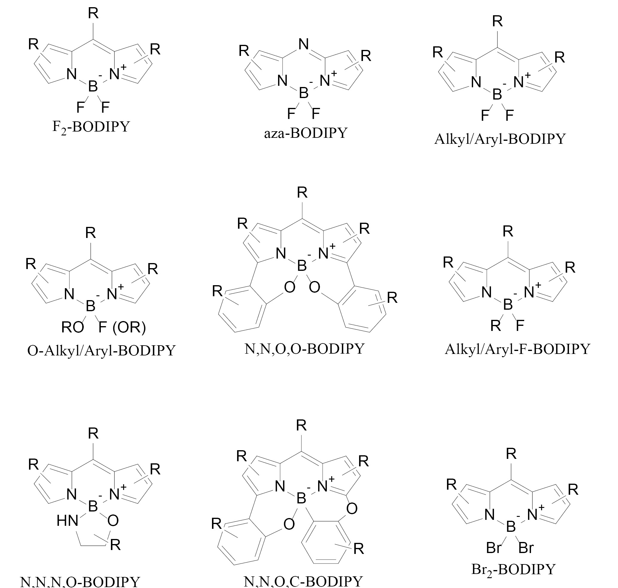 Рис. 2. Структуры различных подклассов BODIPY. Заместители вокруг индаценового ядра (R) могут быть одинаковыми или различными