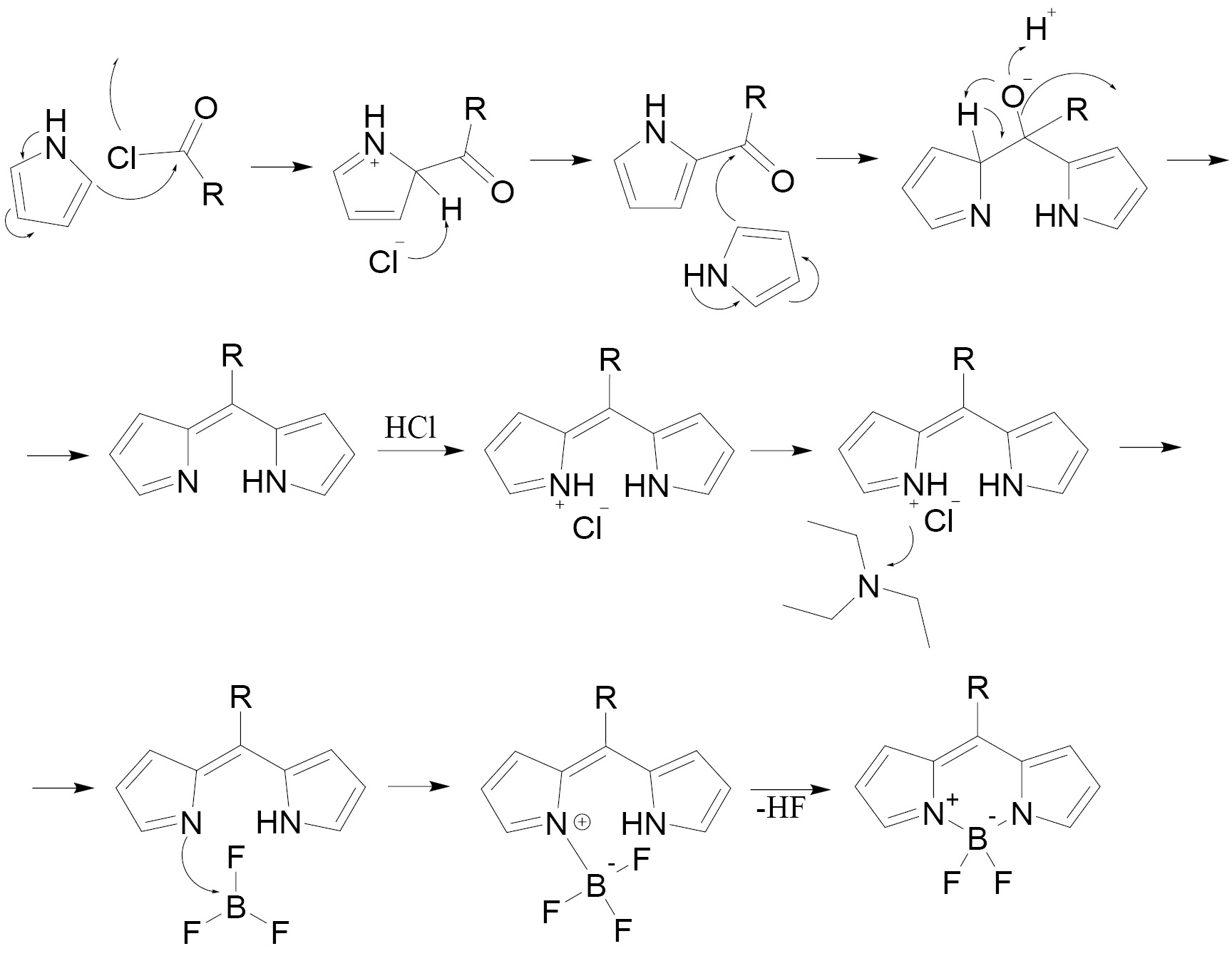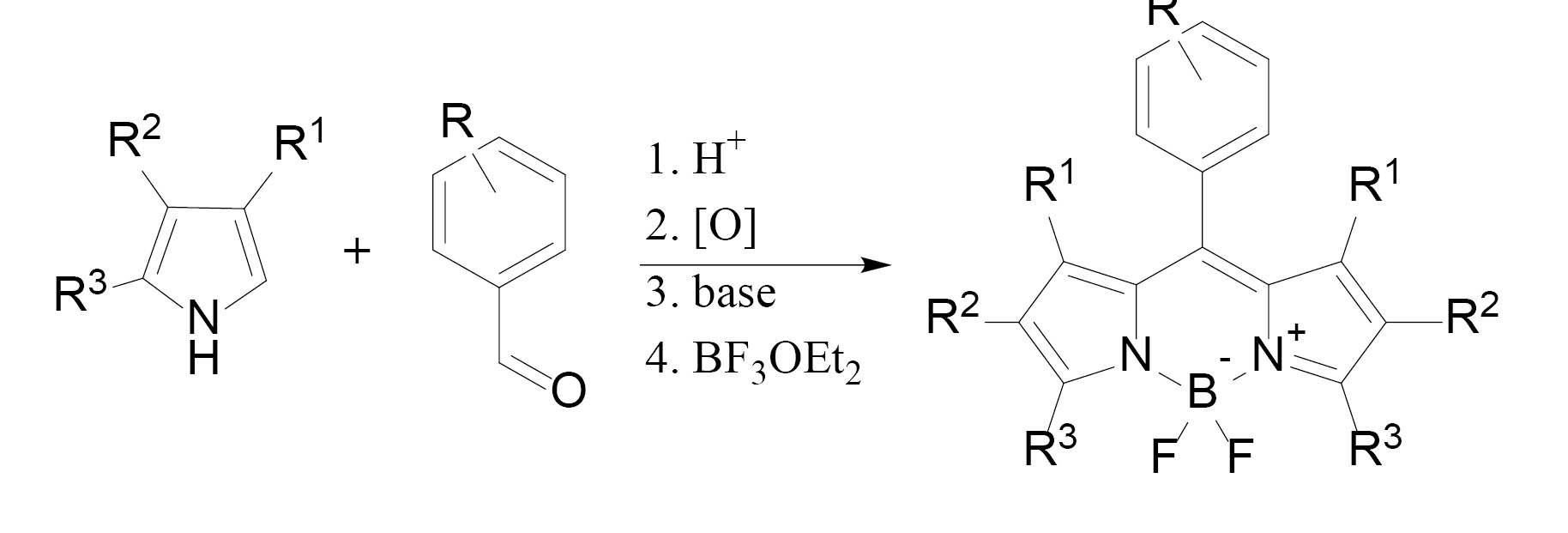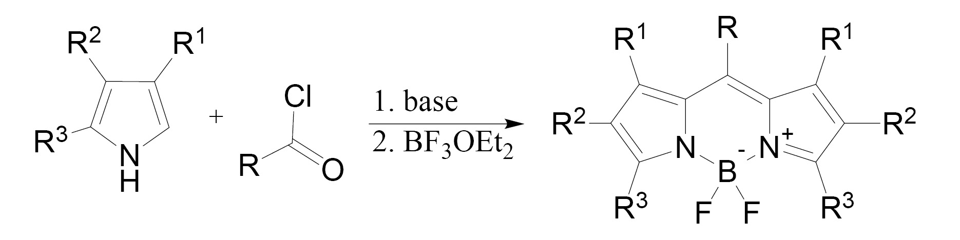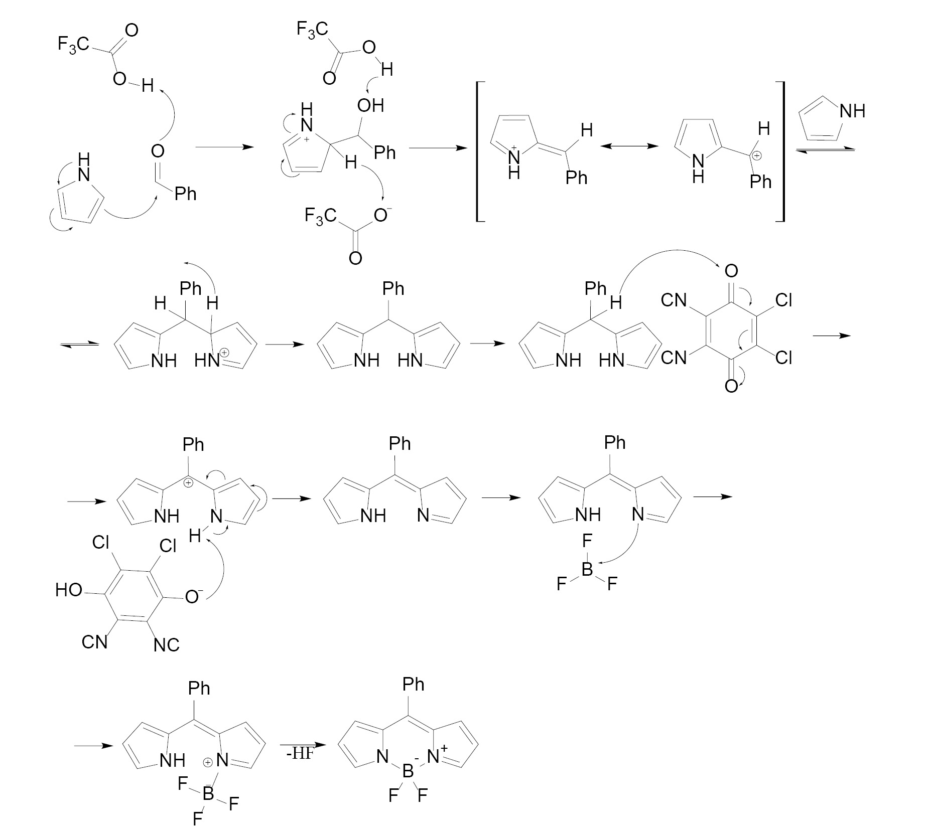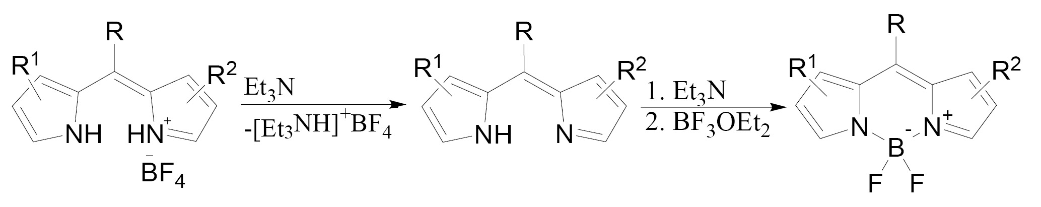 В общем синтез BODIPY можно условно разделить на 2 стадии: образование дипирролилметена из пиррола и источника мезо-атома углерода (схема 1, a), образование бордипирролилметена из дипирролилметена (схема 1, b).