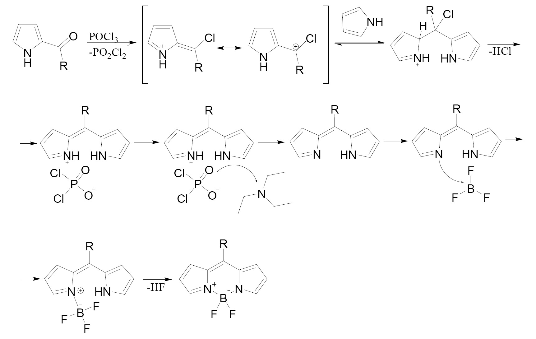 Также показано [77], что оксихлорид фосфора непосредственно участвует в реакции, а при замене этого реагента на другую кислоту Льюиса (например, на трифторуксусную кислоту или эфират трехфтористого бора) катион дипирролилметена не образуется [77].