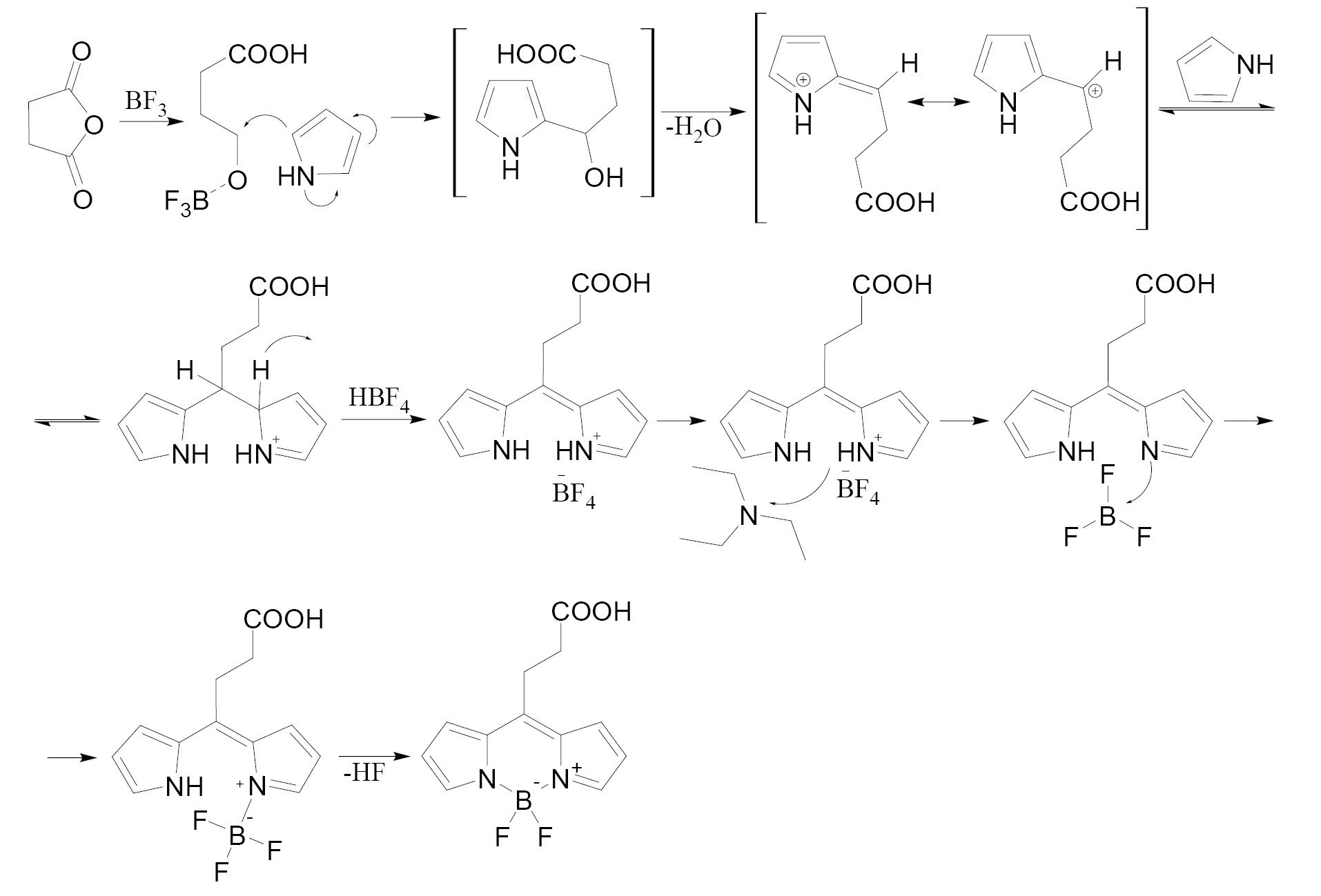 В основе метода лежит нагревание ангидрида с пирролом нужной структуры (обязательно со свободным α-положением) в присутствии каталитического количества эфирата трехфтористого бора. В результате происходит раскрытие цикла ангидрида дикислоты (например, янтарного ангидрида) при атаке трифторидом бора с последующим образованием пиррилкарбинола, который превращается в ион азафульвения. Данный ион атакует вторая молекула пиррола, что в конечном итоге приводит к образованию дипирролилметена, вероятно, в форме тетрафторбората (схема 10) [28, 86, 87].