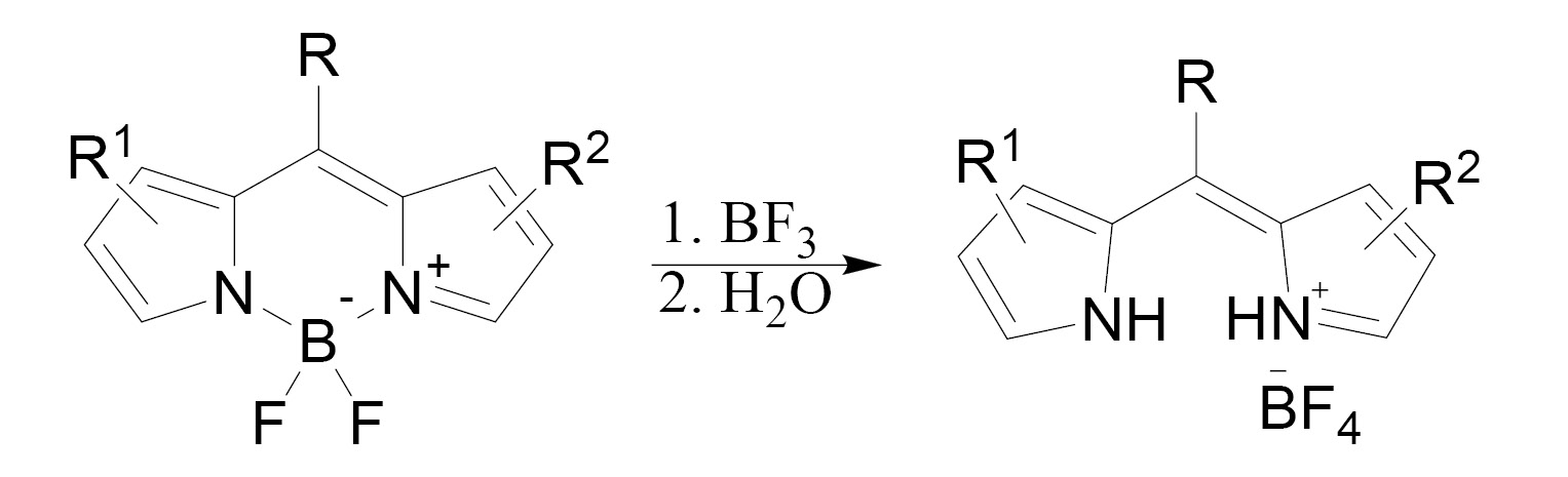 К полученному дипирролилметену добавляют основание и BF3OEt2, в результате чего образуется бордипирролилметен [29]. Подробно образование продукта дипирролилметена с трифторидом бора описано выше (схема 5).