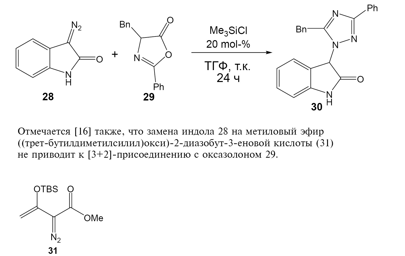 Отмечается [16] также, что замена индола 28 на метиловый эфир ((трет-бутилдиметилсилил)окси)-2-диазобут-3-еновой кислоты (31) не приводит к [3+2]-присоединению с оксазолоном 29.