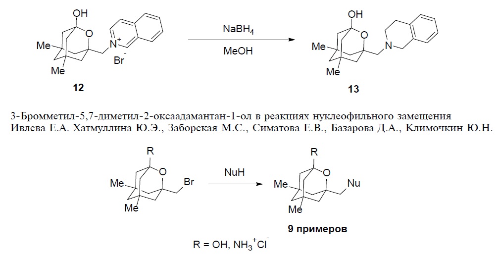 Ранее мы подробно рассмотрели возможные методы построения системы 2-оксаадамантана, предложили новый подход к синтезу его производных [49, 50] и изучили их превращения в среде серной кислоты [51]. Настоящая работа посвящена изучению химических свойств производных 3-бромметил-2-оксаадамантан-1-олов в реакциях нуклеофильного замещения.