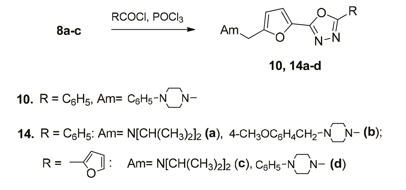 С целью получения гетероцикличекой системы, в которой фурановое кольцо непосредственно связано с ядром 1,3,4-оксадиазола, осуществлен синтез соответствующих гидразидов. Реакцией эфирoв 2а–d и 3 с гидразин-гидратом получены гидразиды 8а–d и 7с. Гидразид 8a взаимодействием с бензоилхлоридом переведен в дибензоилзамещенный гидразин 9, циклизованный действием хлорокиси фосфора в 5-пиперазинилметилзамещенный оксадиазолилфуран 10 (схема 2).