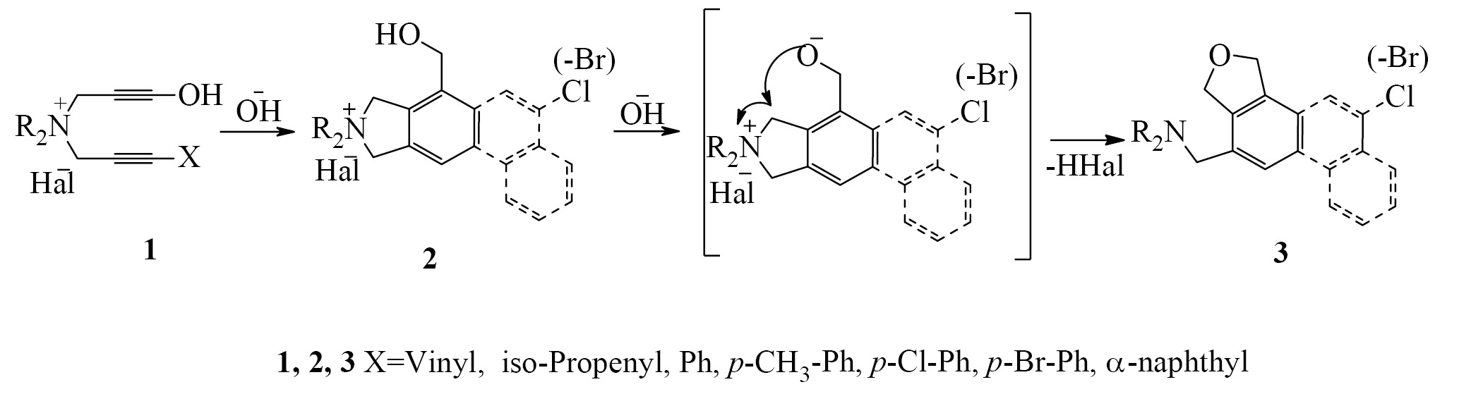 В катализируемую основанием внутримолекулярную циклизацию также вовлекали соли, содержащие в качестве p2-фрагмента -4-гидроксибут-2-инильную группу, наряду с различными ениновыми группами - 3-алкенил, 3-фенил-, или 3-α-нафтилпроп-2-инильной (1) [9, 10]. В результате реакции с высокими выходами получены галогениды 2,2-диалкил-4-гидроксиметилизоиндолиния, 2,2-диалкил-4-гидроксиметилбенз[f]изоиндолиния, 2,2-диалкил-4-гидроксиметилнафт[f]изоиндолиния (2). В ходе исследований обнаружено, что также проходила реакция внутримолекулярной рециклизации, включающая стадии разрыва изоиндолиниевого цикла и образования дигидрофуранового кольца (3) (общая схема 1) [9, 10].
