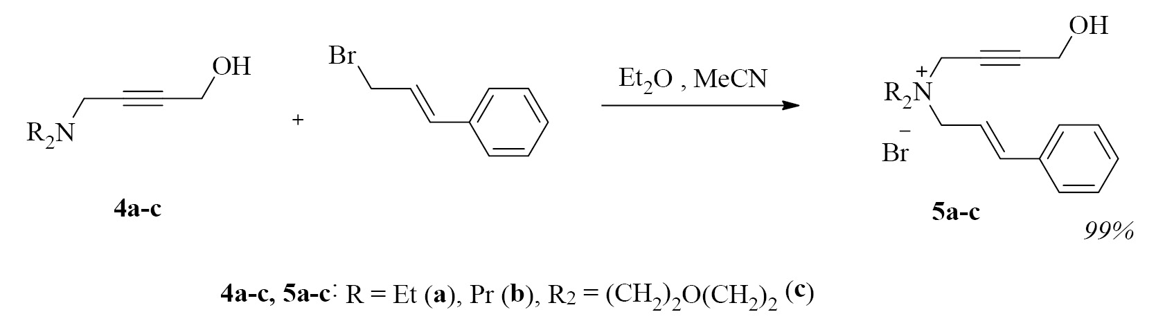 Алкилированием диалкил(4-гидроксибут-2-инил)аминов 4а–c (3-бромпроп-1-ен-1-ил)бензолом синтезированы четвертичные аммониевые соли 5а–c, содержащие 4-гидроксибут-2-инильную группу, наряду с 3-фенилпроп-2-енильной (схема 2).