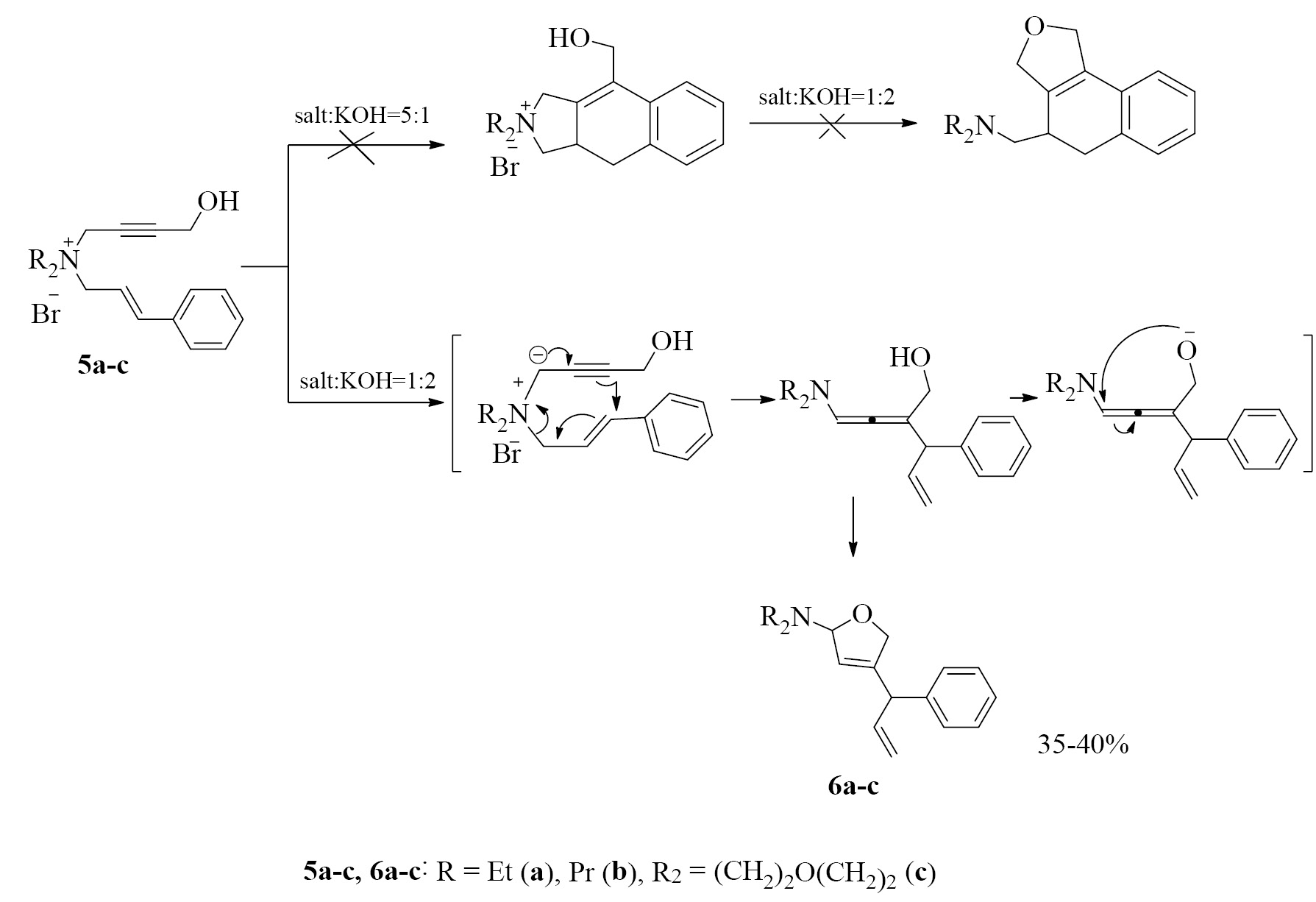 Взаимодействие бромидов диалкил(4-гидроксибут-2-инил)(3-фенилпроп-2-енил)аммония 5а–c в присутствии водной щелочи. Общая методика. К раствору, состоящему из 10 ммоль соли 5a–с (2.58 г – 5а, 2.86 г – 5b, 2.72г – 5с), и 2 мл воды, порциями прибавляли 2 ммоль 0.7 мл 3 н. водного раствора КОН (мольное соотношение соль–основание 5:1). Саморазогревание не наблюдается, смесь нагревали на водяной бане 2 ч, после чего смесь экстрагировали эфиром (2 × 30 мл) для удаления возможных побочных продуктов и подкисляли водным раствором HBr. Под низким давлением отгоняли воду досуха. Абсолютным этанолом экстрагировали органическую соль. Эфирным осаждением из спиртового раствора выделяли не ожидавшиеся циклические соли, а, по данным ЯМР спектроскопии, непрореагировавшие исходные соли 5a–с, которые не участвовали в циклизации.