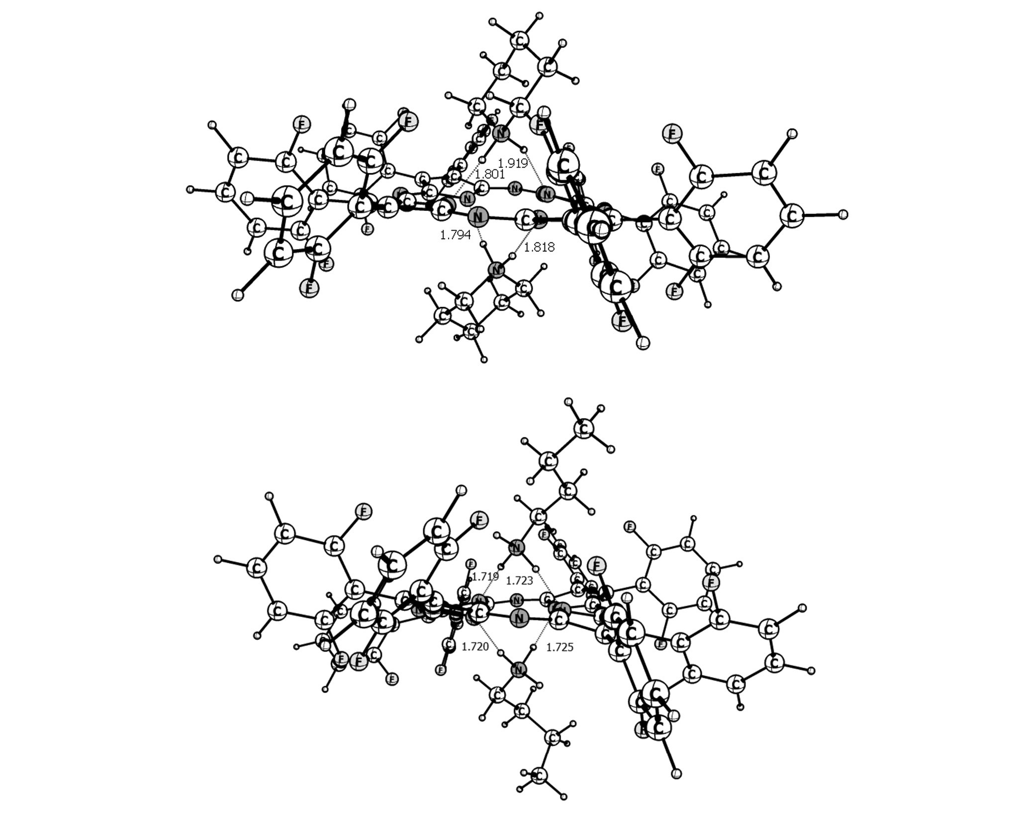 Оптимизацию геометрических параметров комплексов H2Pa(C6H3F2)8 с пиперидином и н-бутиламином проводили с помощью программного обеспечения Gaussian09 [15] в рамках теории функционала плотности с учетом нулевого заряда и синглетного электронного состояния. Использовали трехпараметрический гибридный обменно-корреляционный функционал CAM-3LYP [16] и базисный набор cc-pVTz [17]. Расчеты всех моделей проводили in vacuo.